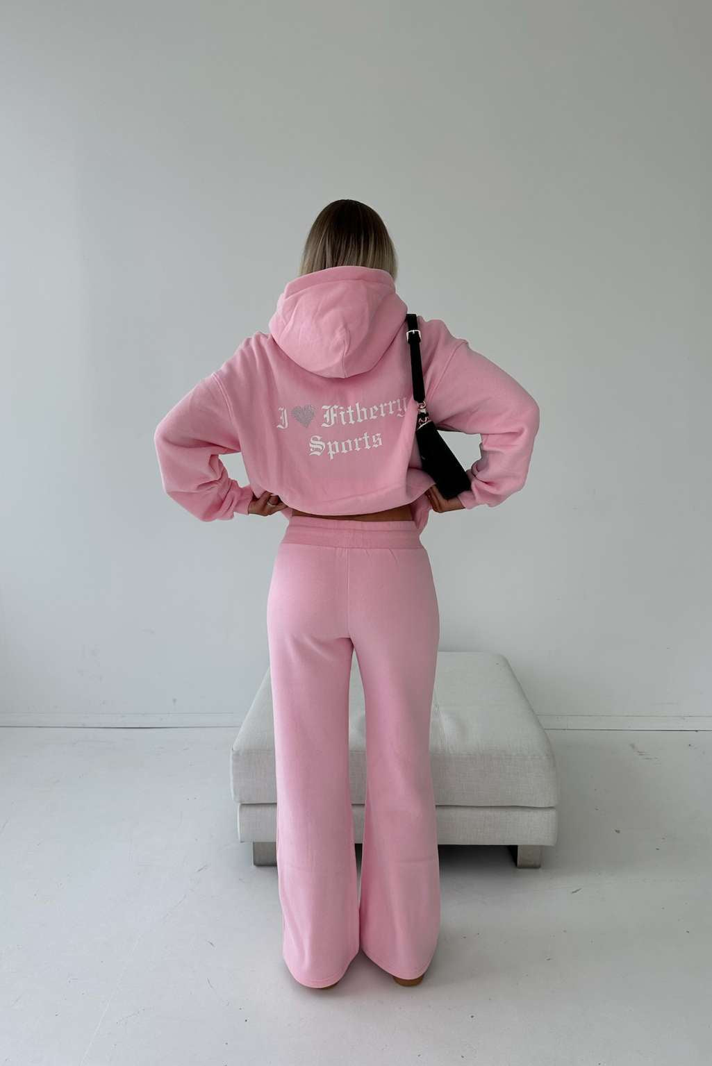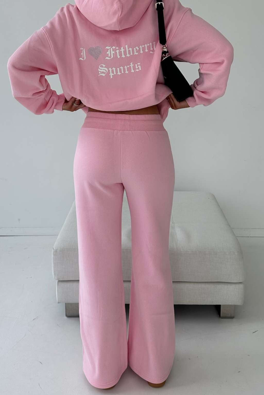 I ♥ FITBERRY® LOW WAIST FLARED JOGGERS. Joggers with a wide flared leg and a low waist cut. Crafted from a premium high-quality cotton fabric. The joggers have soft fleece interior, adjustable drawstring at waist and I ♥ FITBERRY print with handmade rhinestone heart.