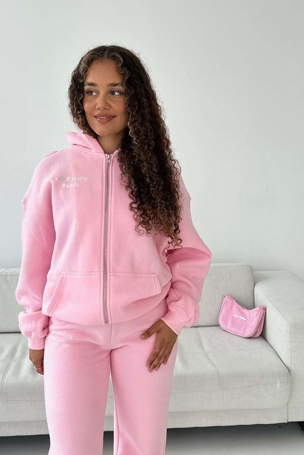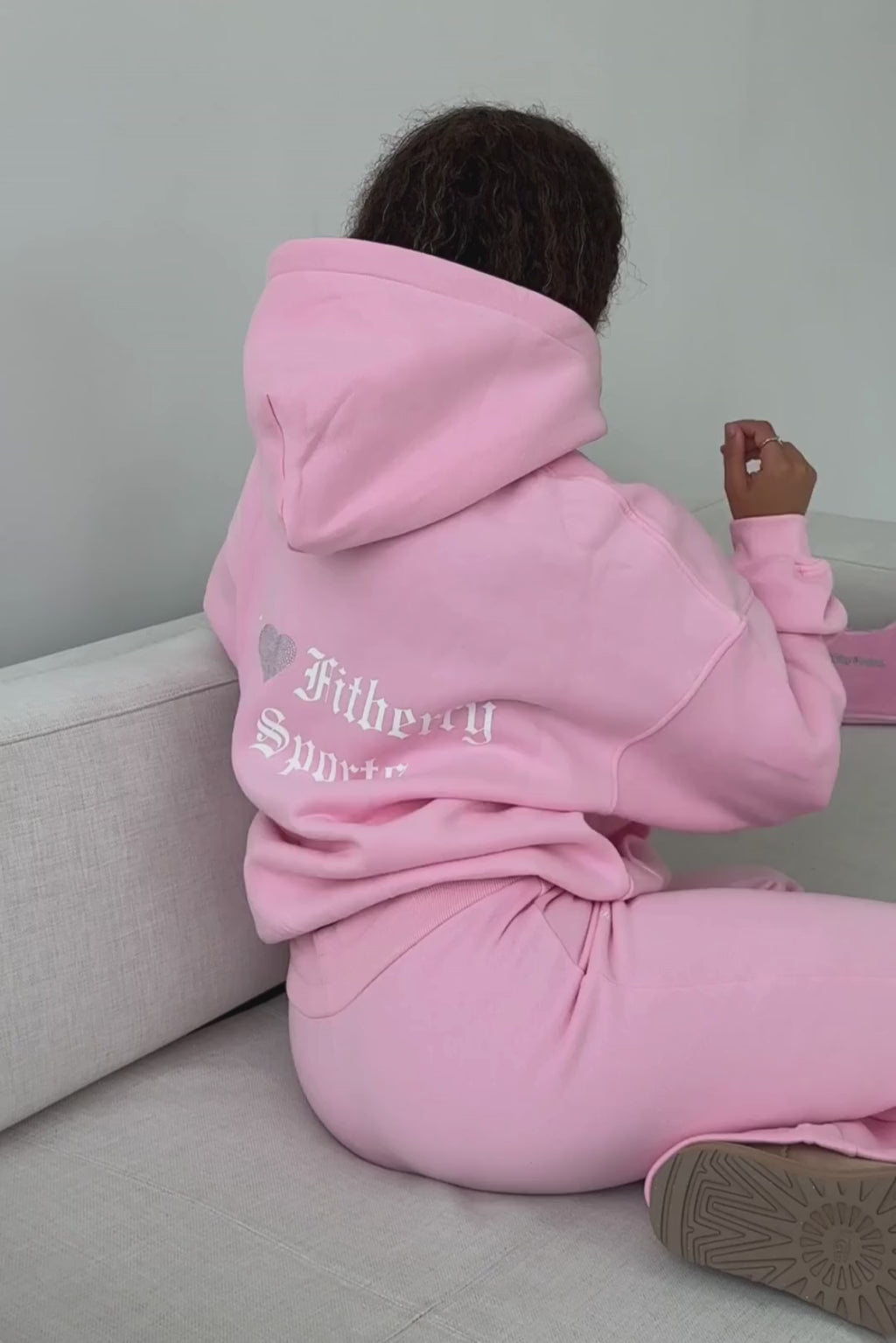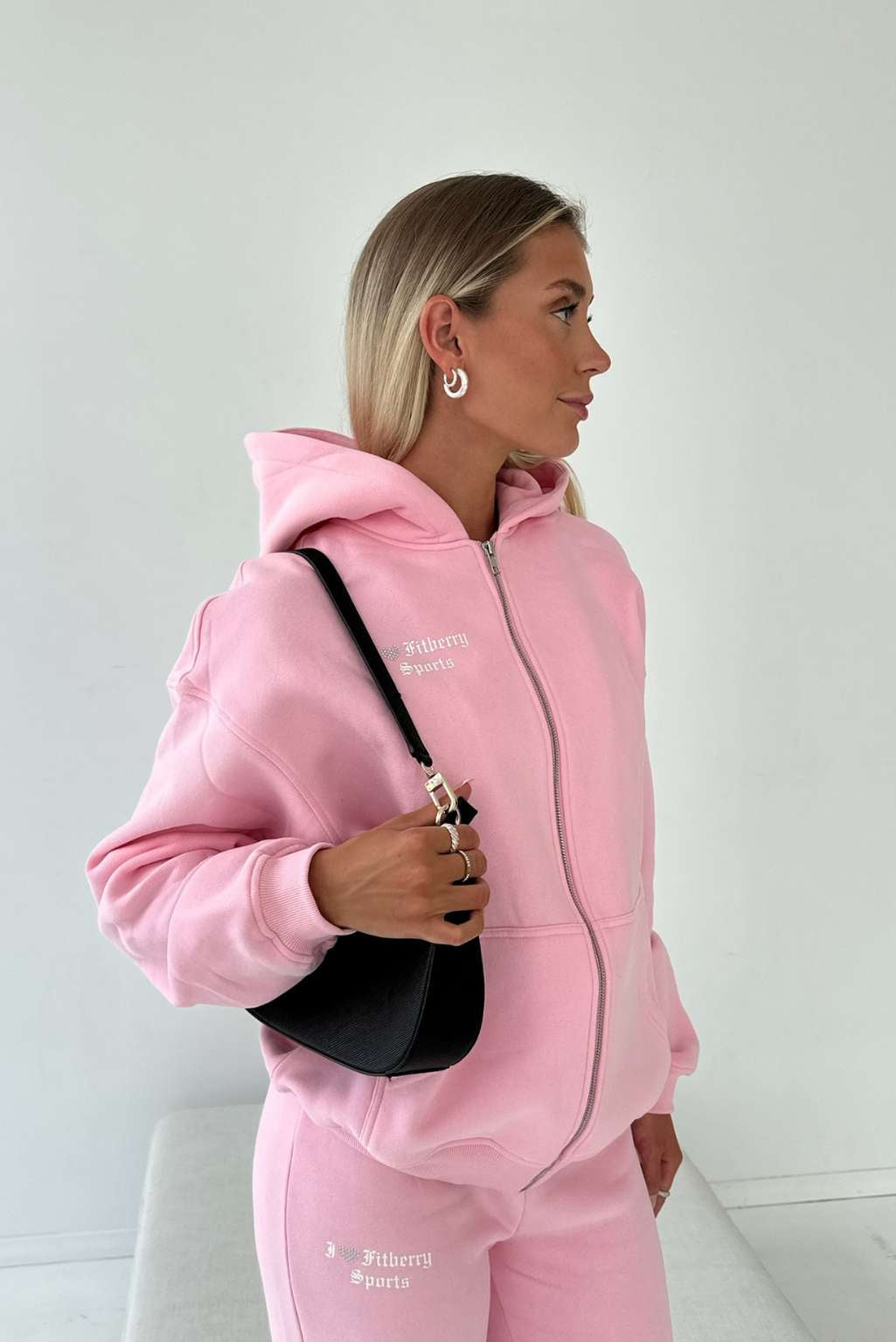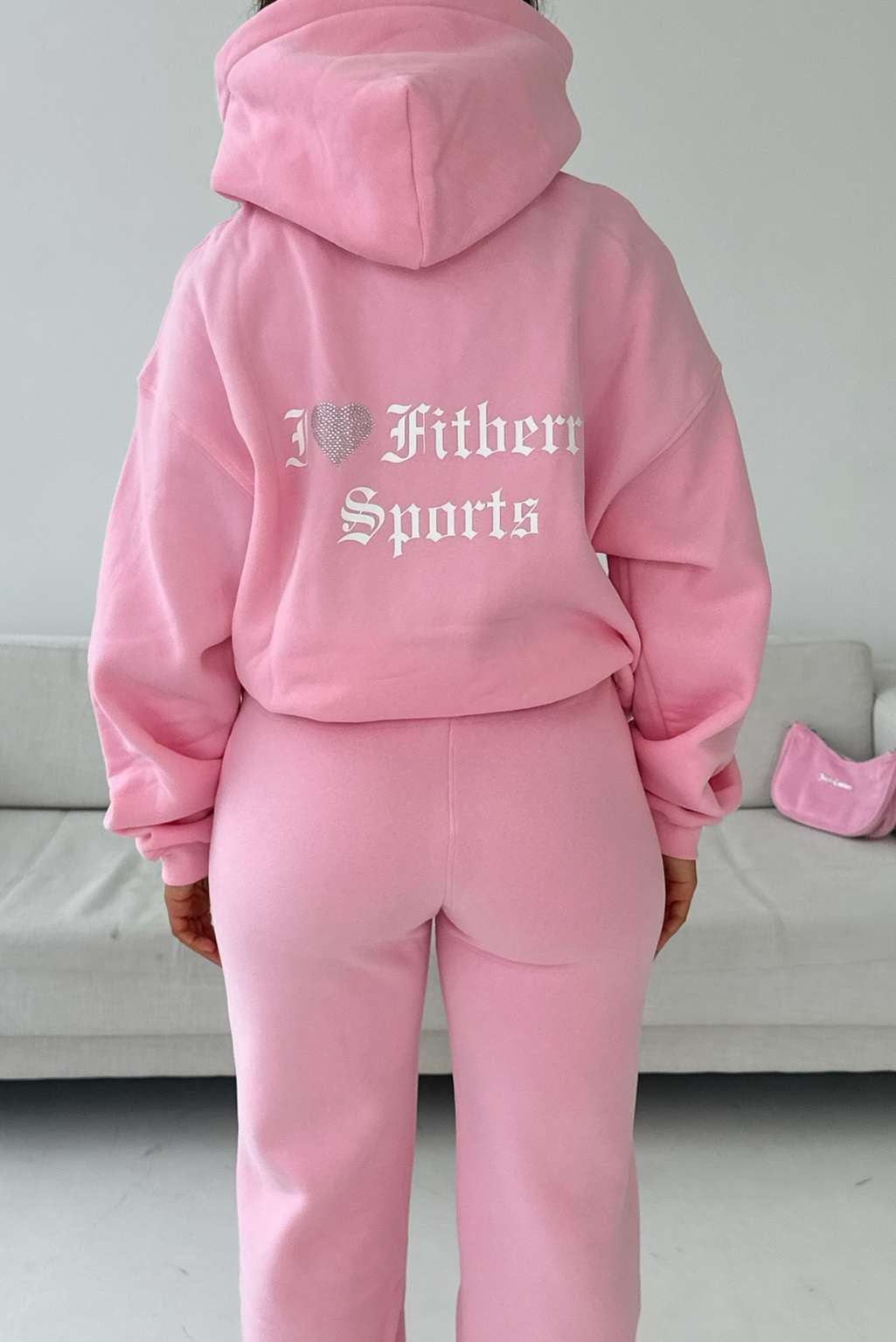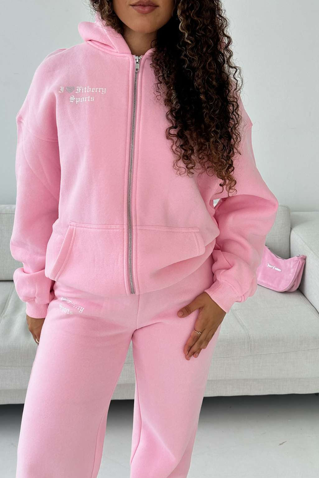 I ♥ FITBERRY® OVERSIZED ZIP HOODIE. An oversized hoodie crafted from premium high-quality cotton fabric. The hoodie has a zipper in front, soft fleece interior, dropped shoulders, side pockets, a cozy hood and ribbed details on the sleeves and waist. Featuring I ♥ FITBERRY print to front and back with handmade rhinestone heart.