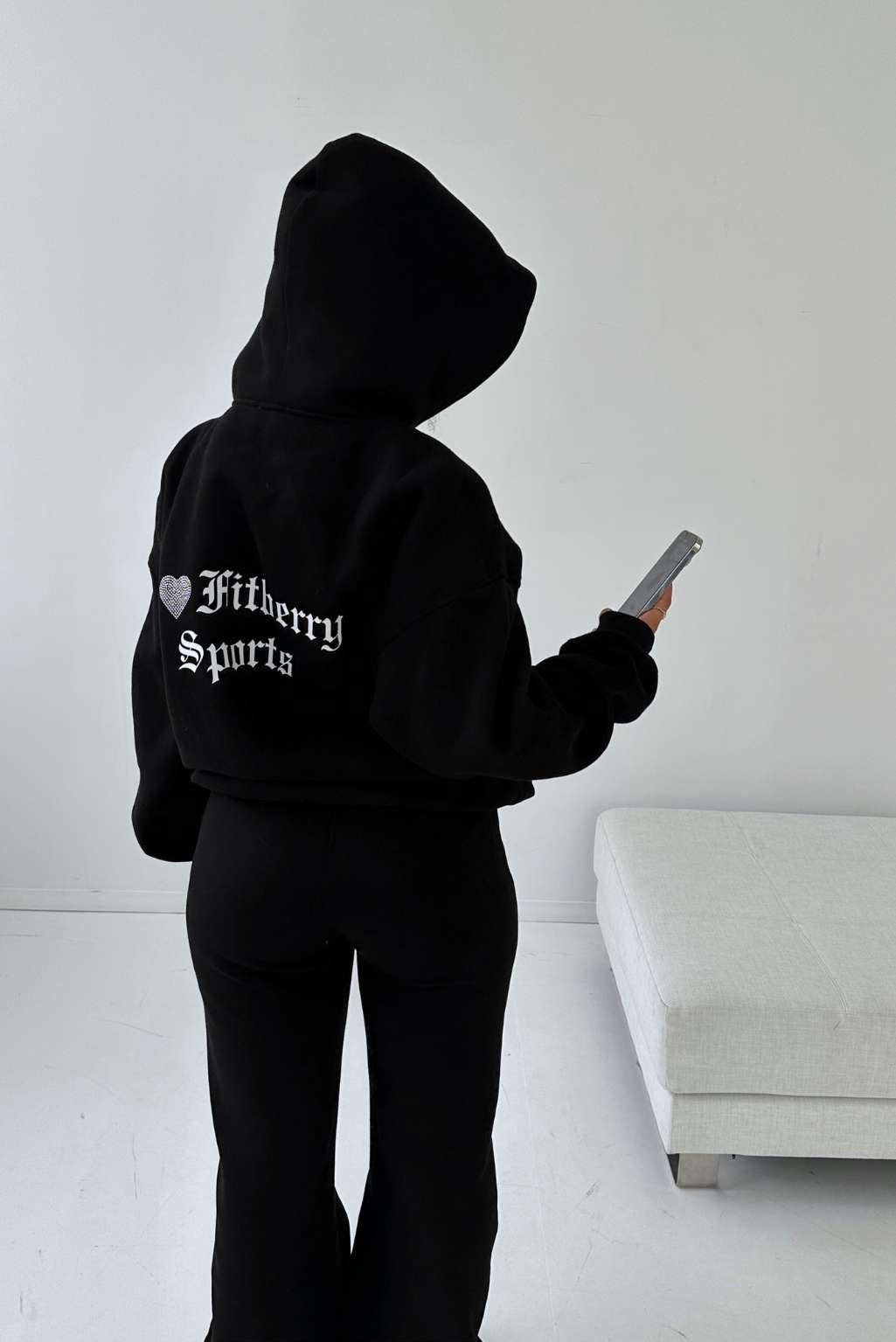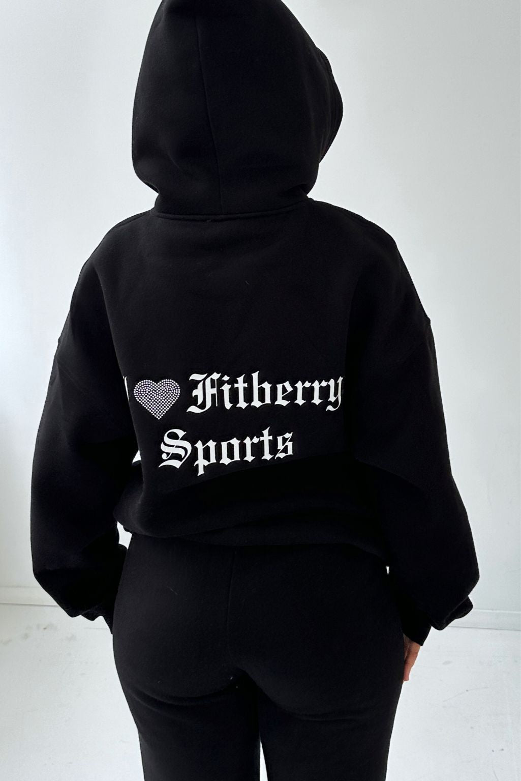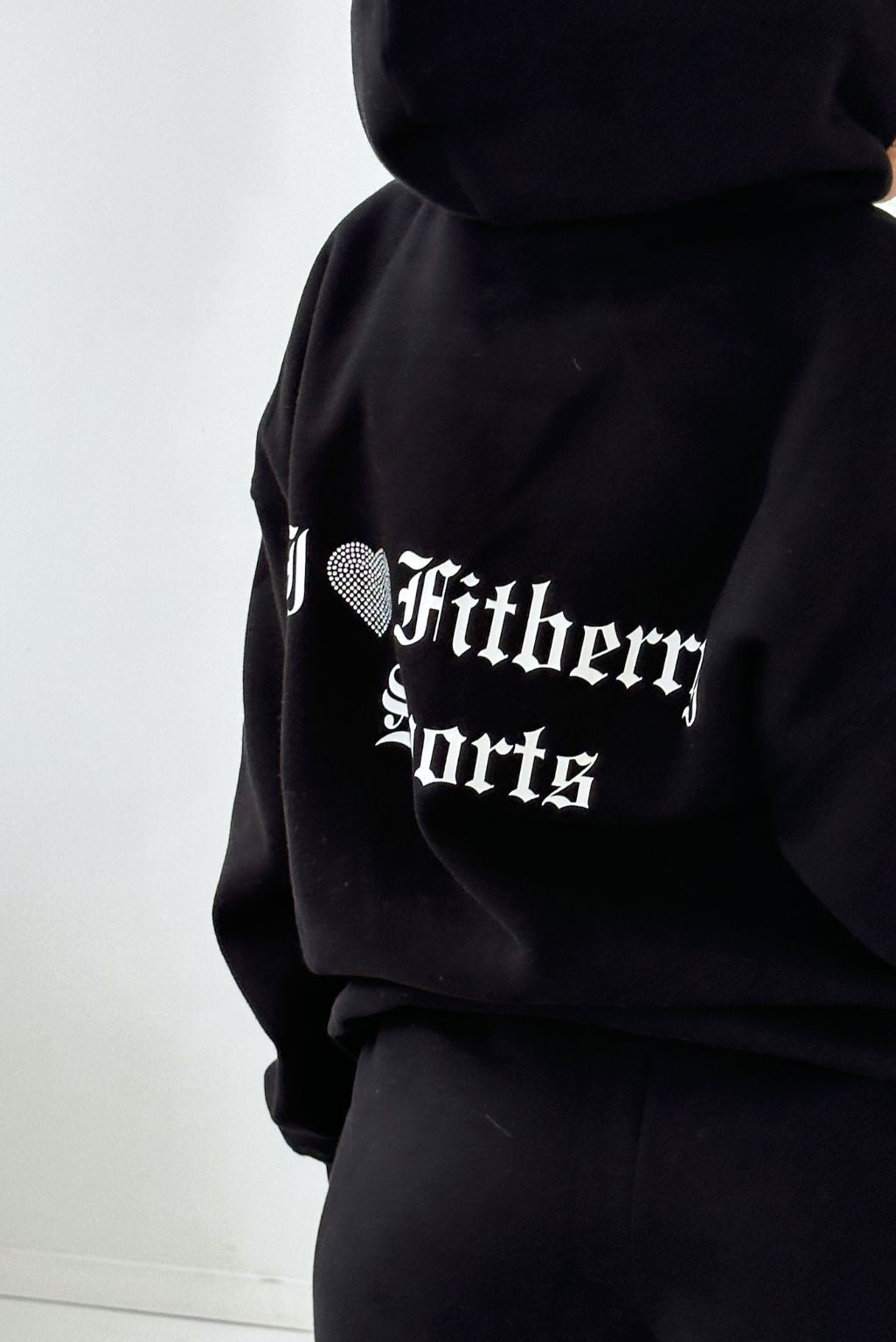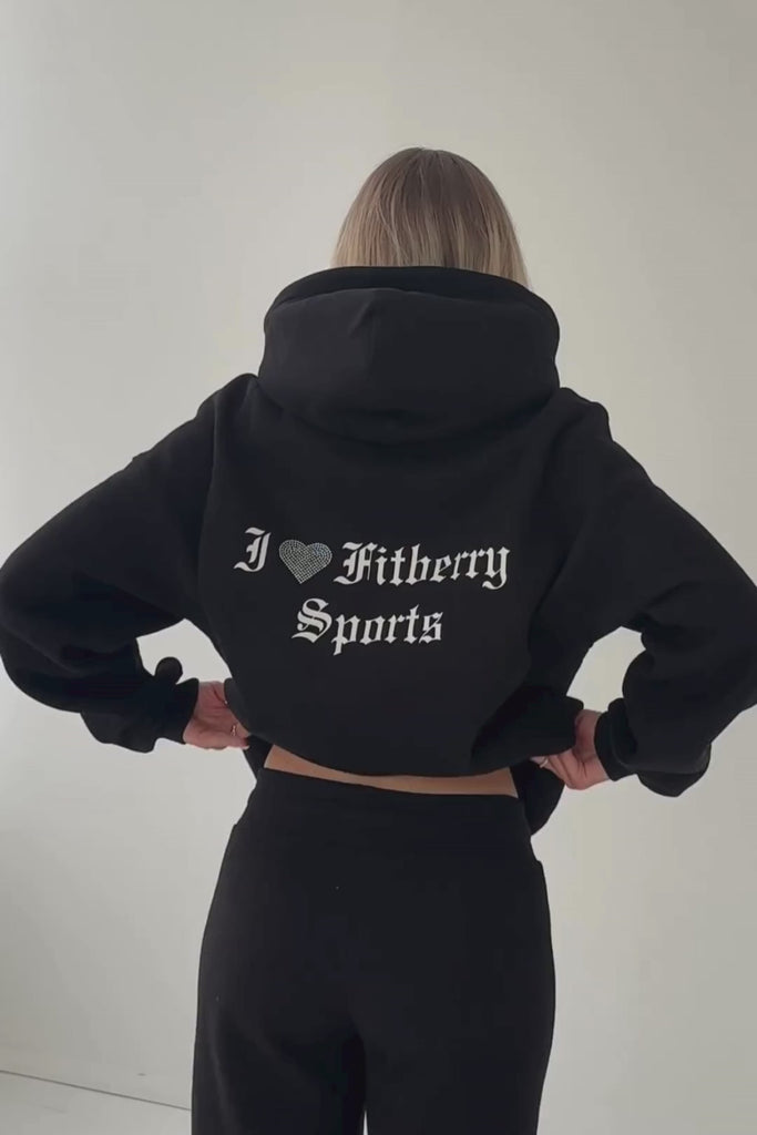 I ♥ FITBERRY® OVERSIZED ZIP HOODIE. An oversized hoodie crafted from premium high-quality cotton fabric. The hoodie has a zipper in front, soft fleece interior, dropped shoulders, side pockets, a cozy hood and ribbed details on the sleeves and waist. Featuring I  FITBERRY print to front and back with handmade rhinestone heart.