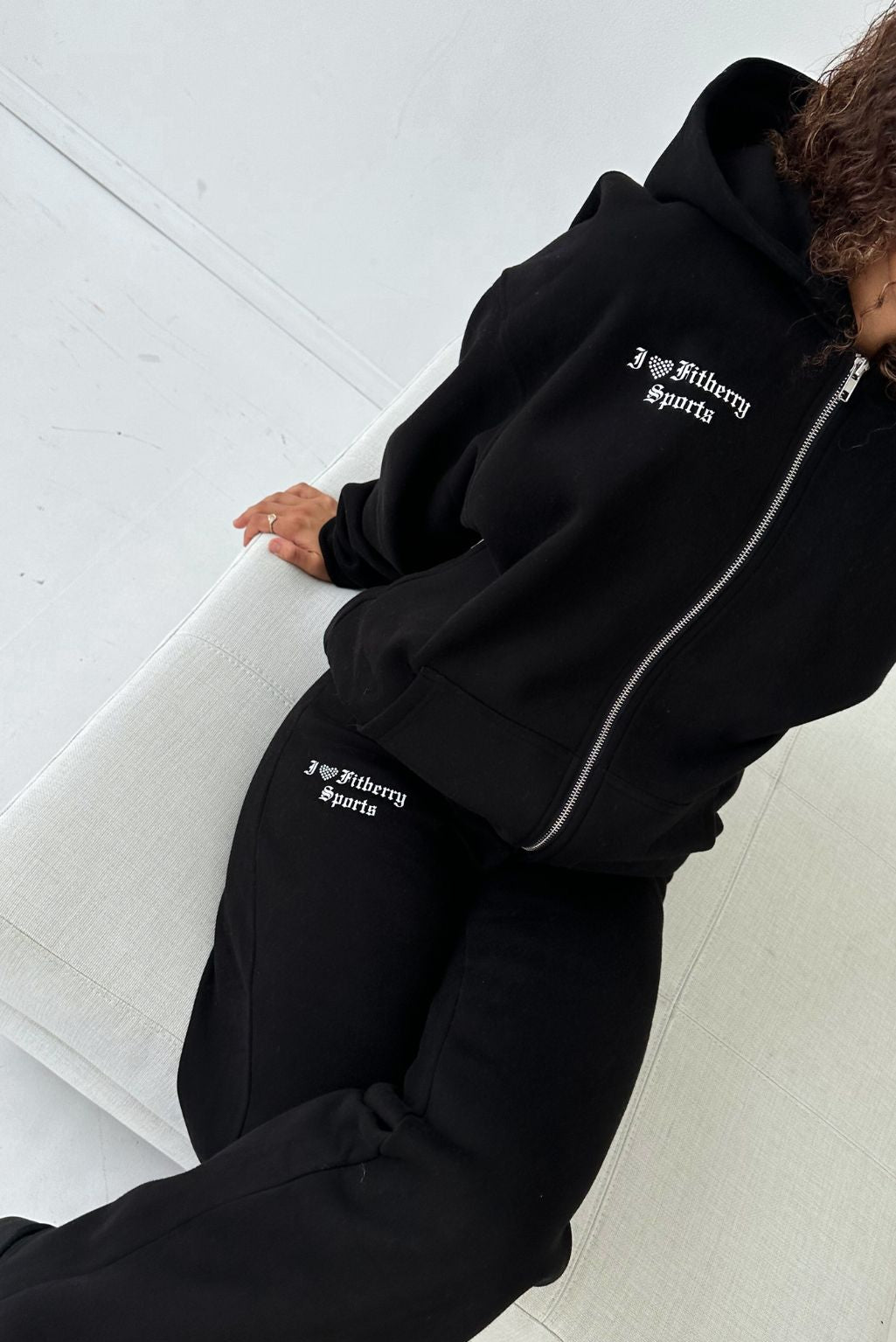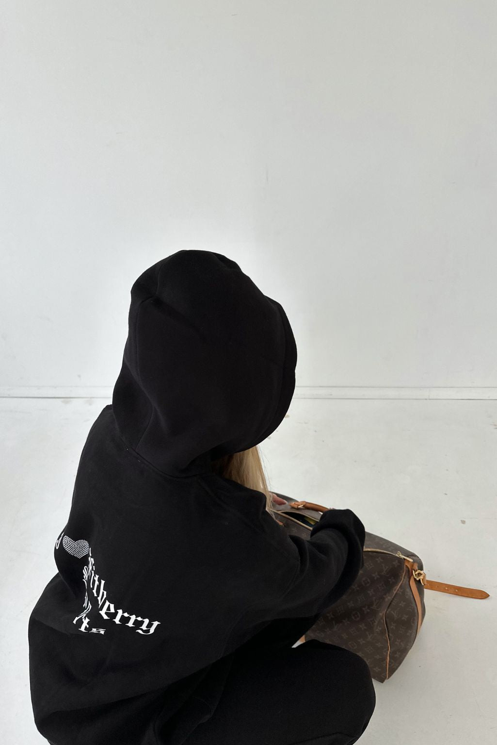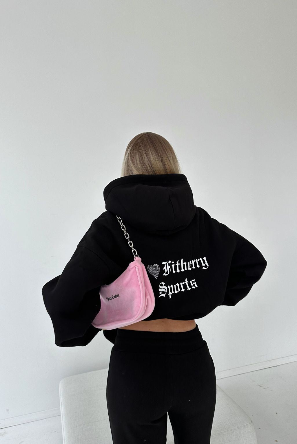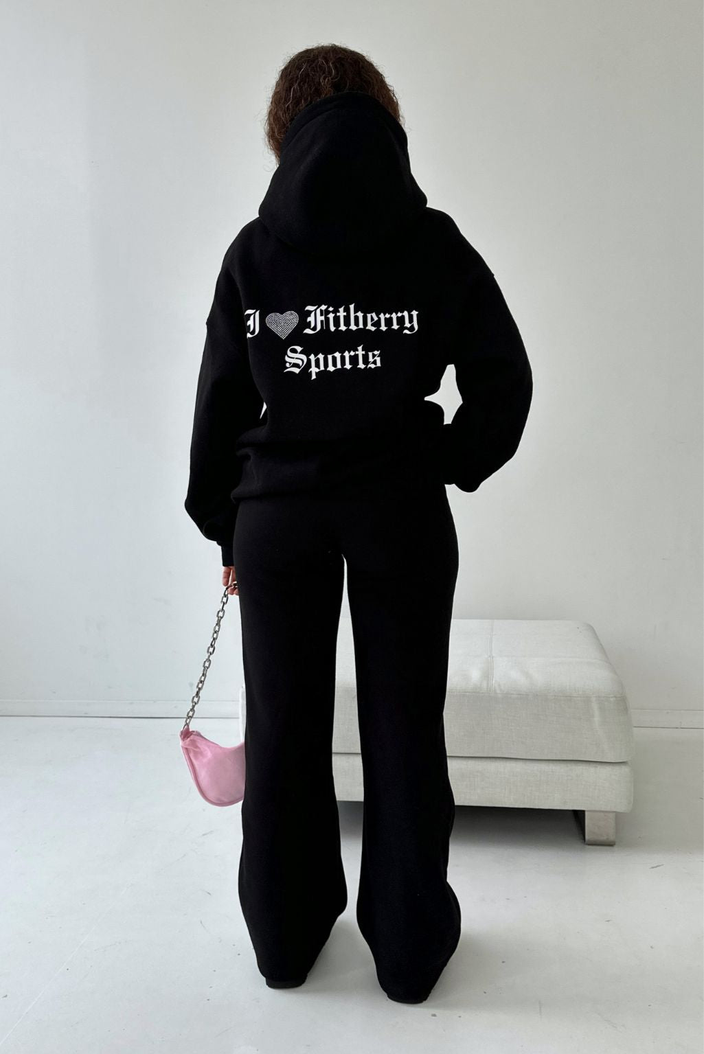 I ♥ FITBERRY® OVERSIZED ZIP HOODIE. An oversized hoodie crafted from premium high-quality cotton fabric. The hoodie has a zipper in front, soft fleece interior, dropped shoulders, side pockets, a cozy hood and ribbed details on the sleeves and waist. Featuring I  FITBERRY print to front and back with handmade rhinestone heart.