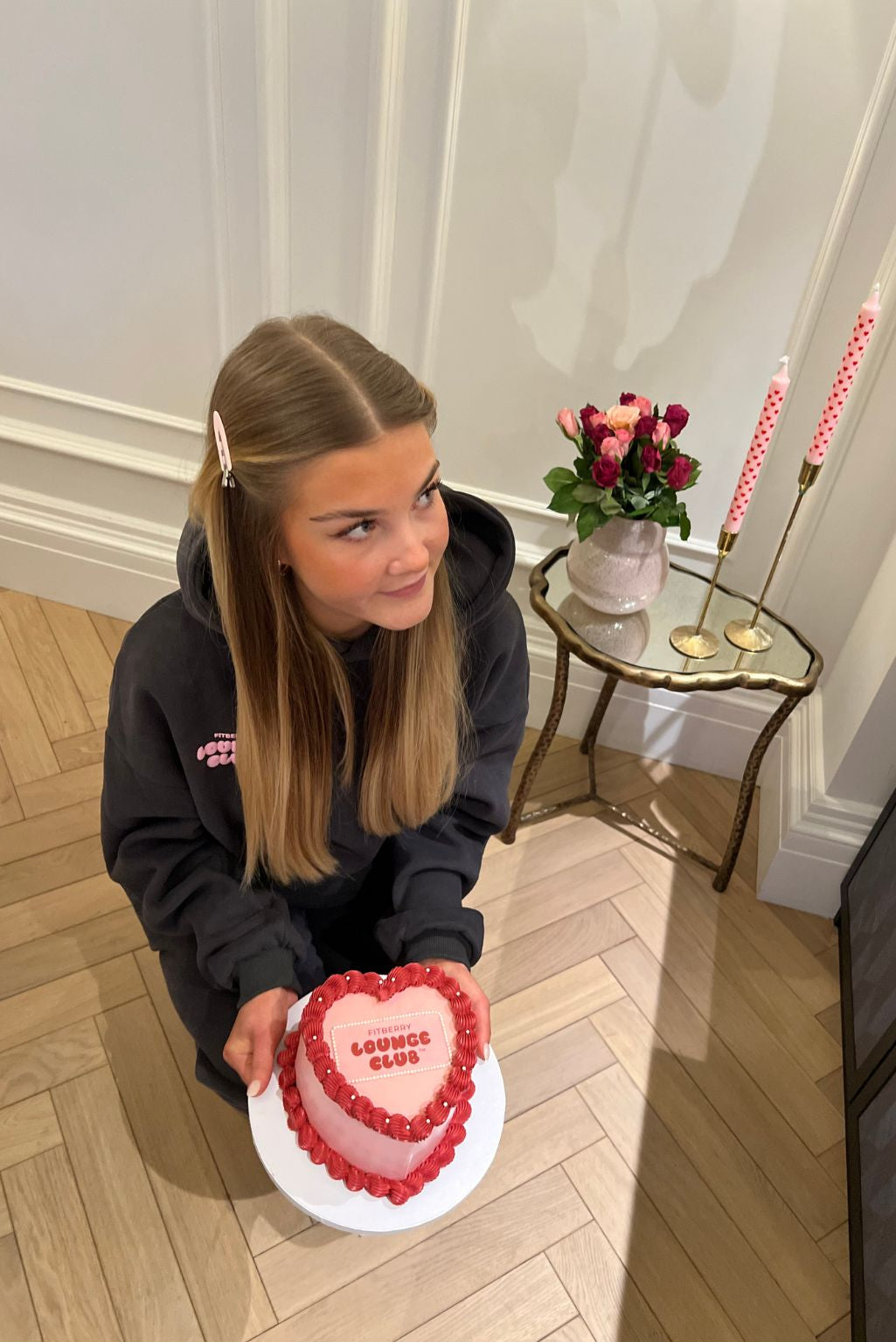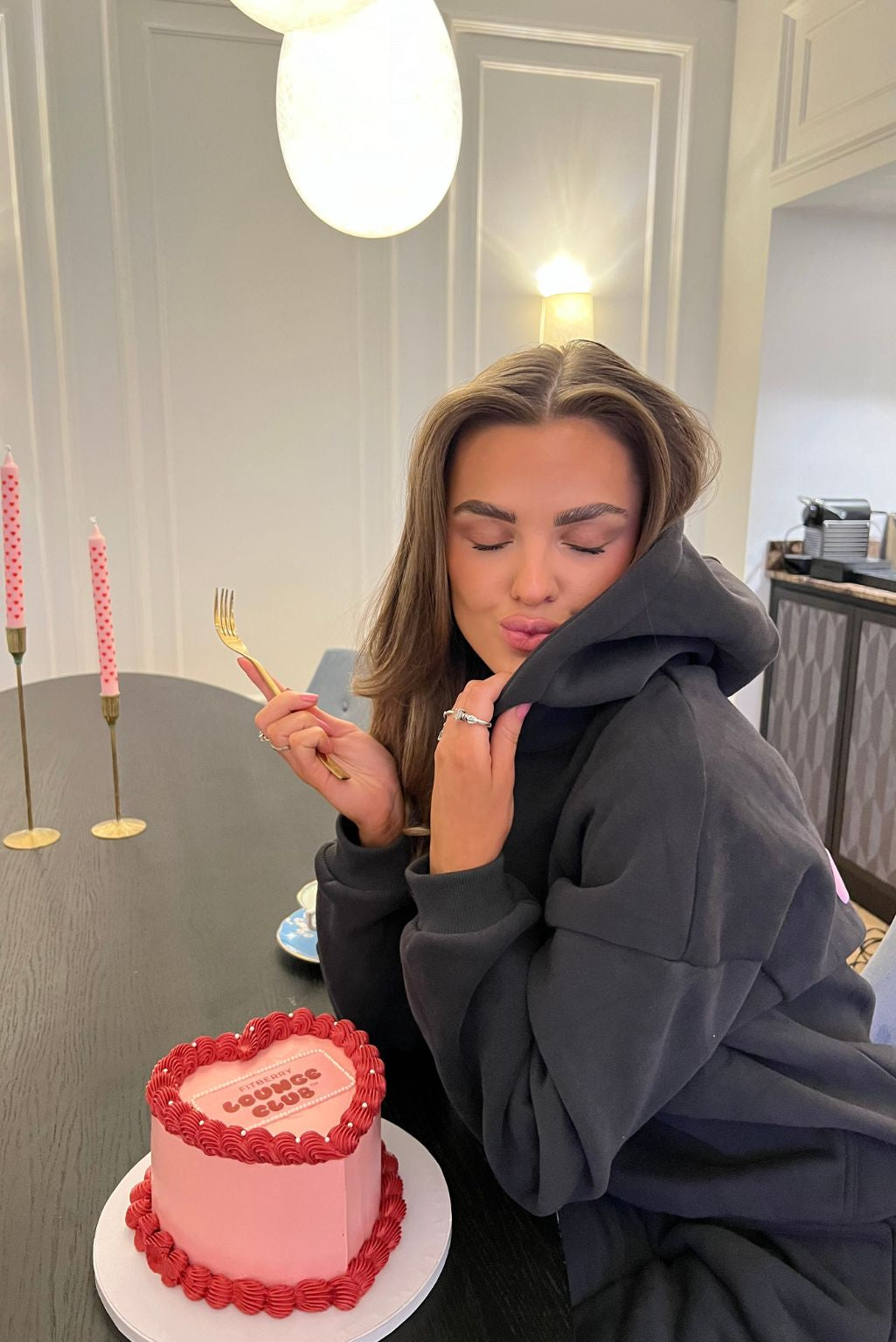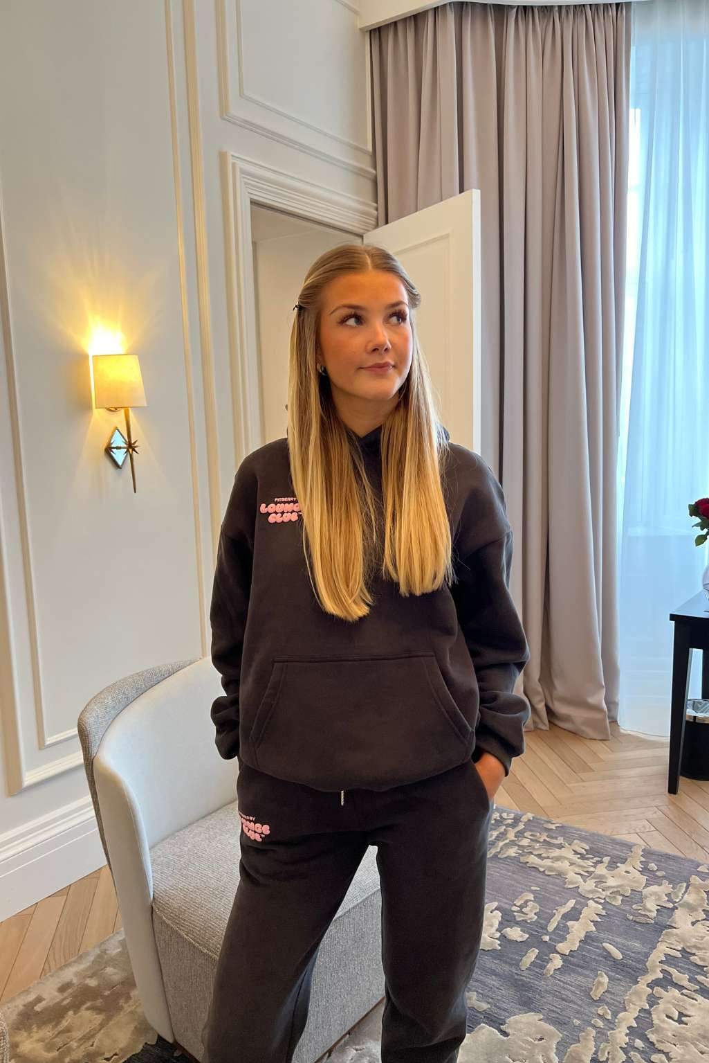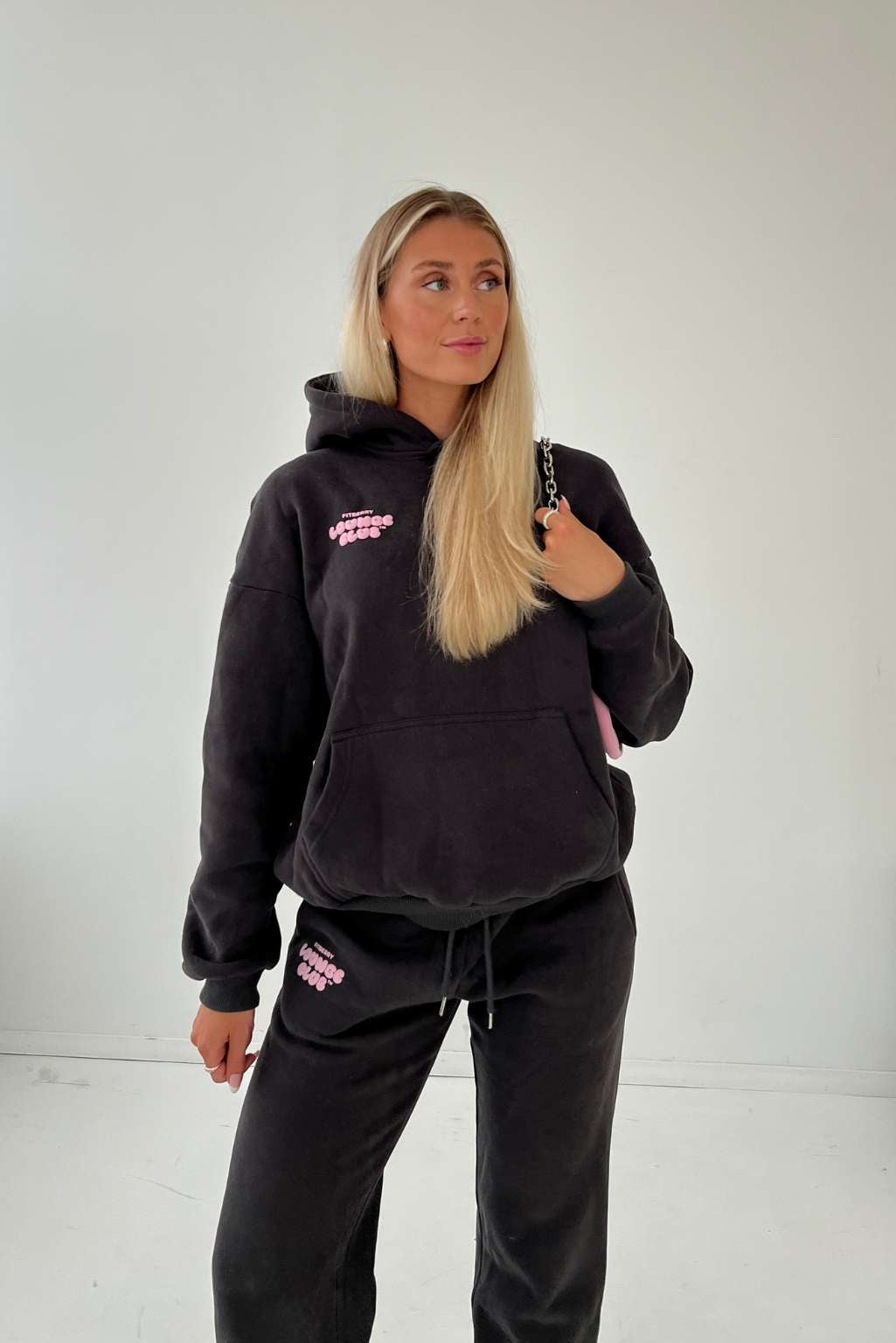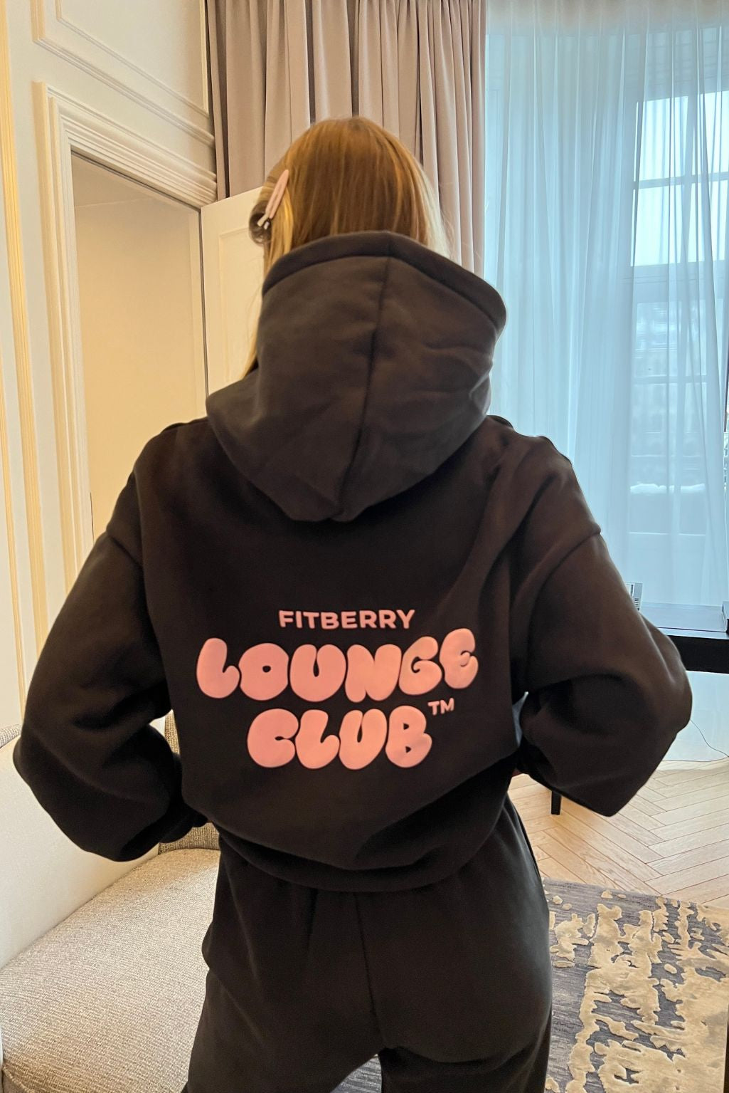FITBERRY® LOUNGE CLUB OVERSIZED HOODIE. An oversized hoodie crafted from a premium high-quality cotton fabric. The hoodie has a soft fleece interior, dropped shoulders, a cozy hood and ribbed details on the sleeves and waist. Featuring our signature Fitberry Lounge Club print to front and back.