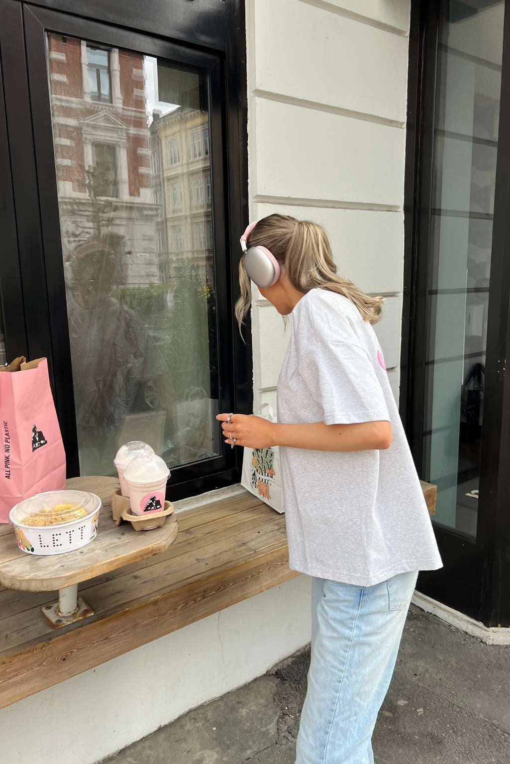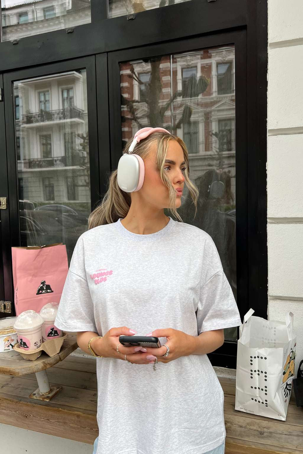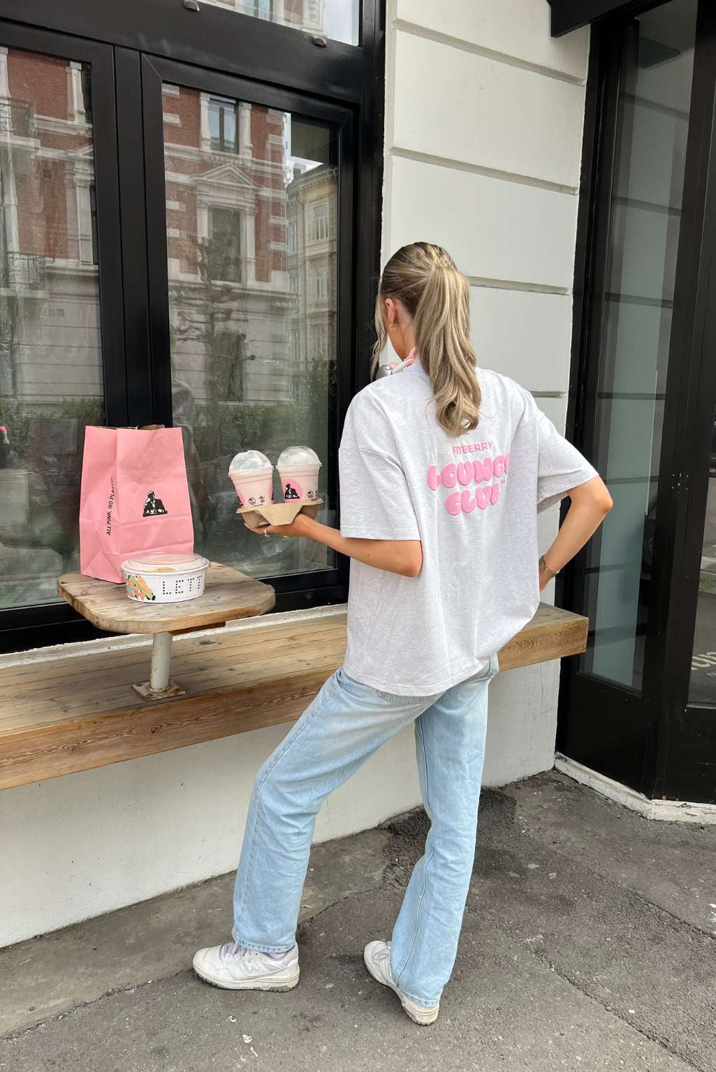 FITBERRY® LOUNGE CLUB OVERSIZED TEE. A t-shirt with an oversized fit. Crafted from a premium high-quality cotton fabric with a soft handfeel. The tee has a round neckline, dropped shoulders, loose sleeves and Fitberry Lounge Club print to front and back.