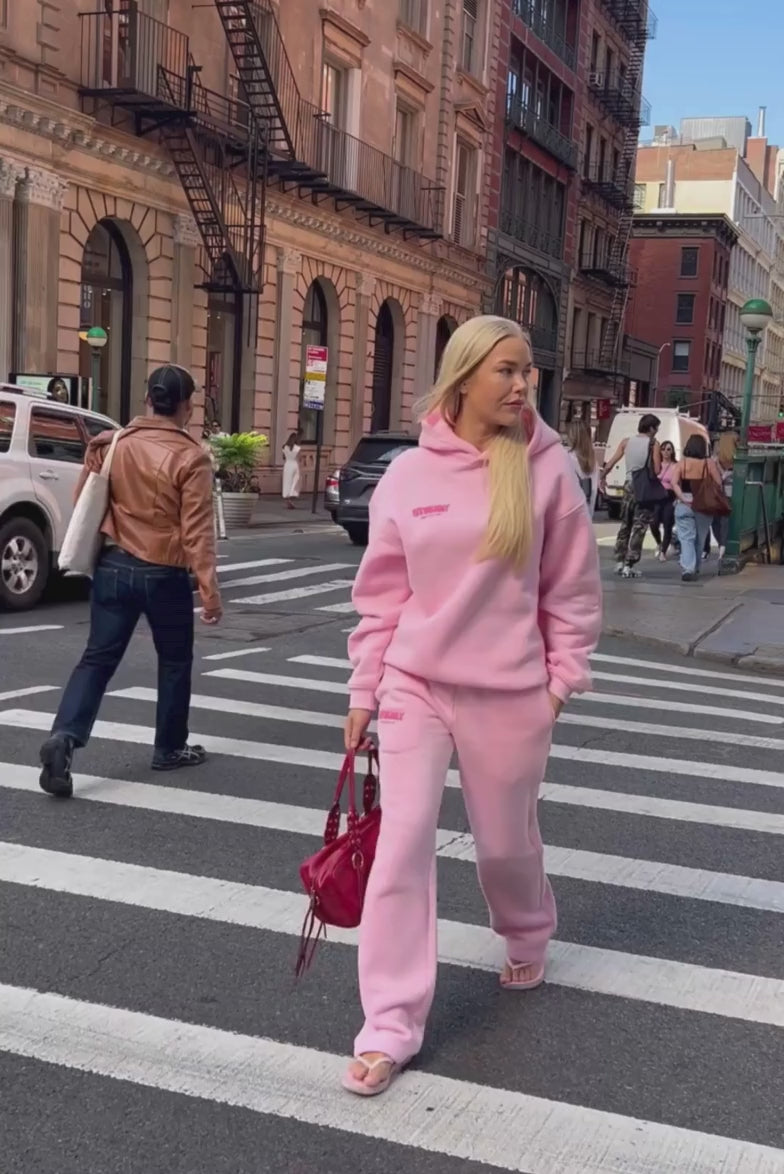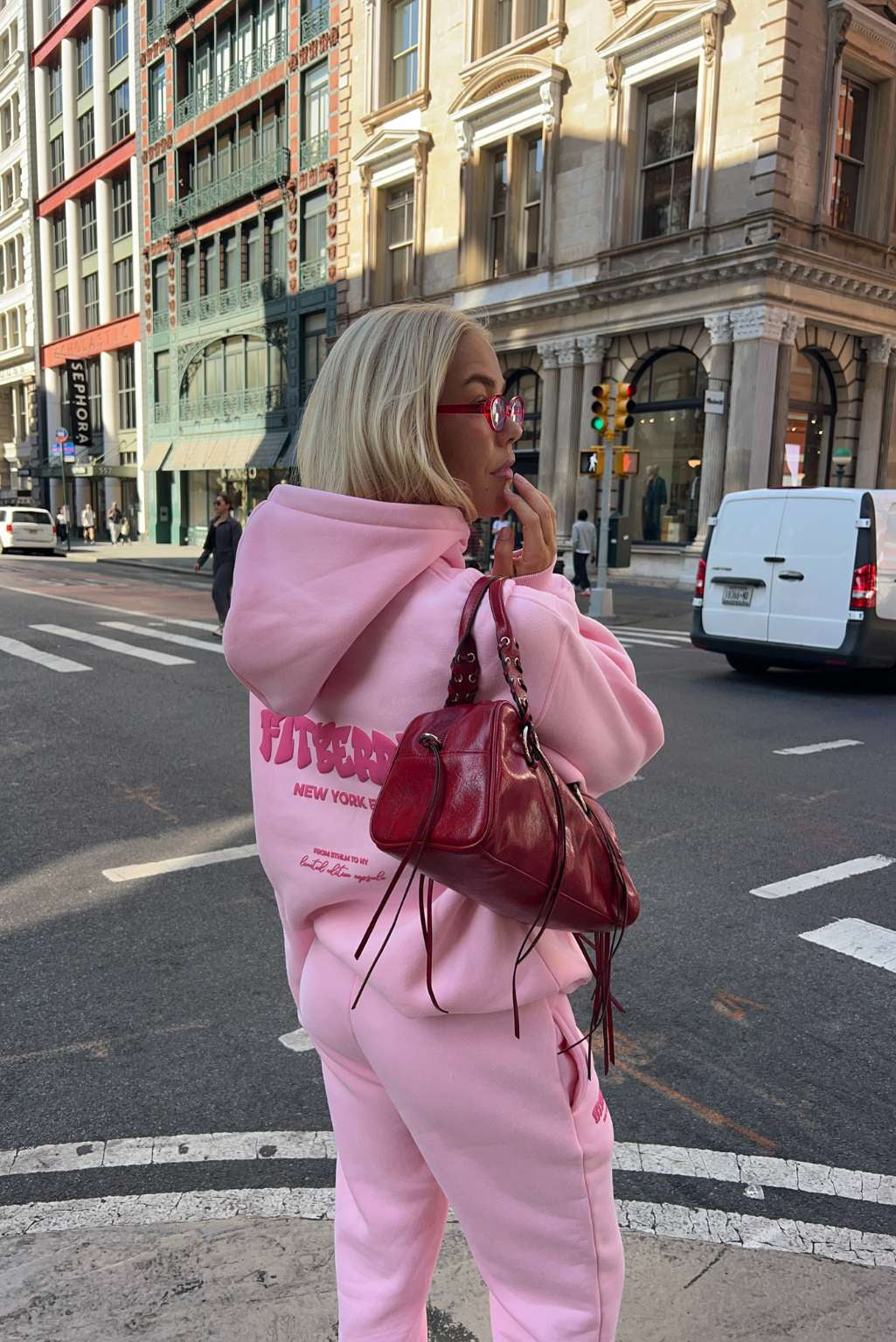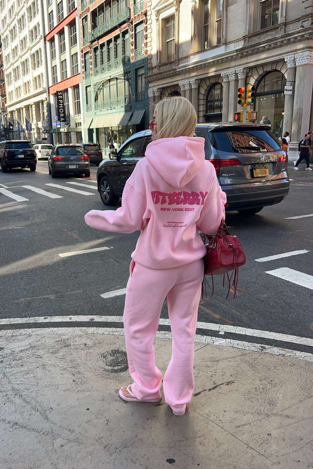 FITBERRY® NEW YORK EDIT OVERSIZED HOODIE. An oversized hoodie crafted from premium high-quality cotton fabric. The hoodie has a soft fleece interior, dropped shoulders, a cozy hood and ribbed details on the sleeves and waist. Featuring Fitberry New York Edit print to front and back.