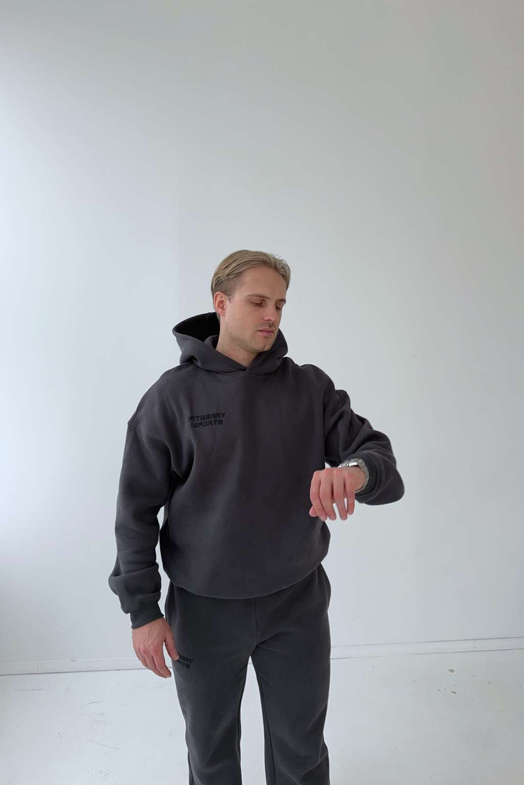 Model 4: Arnold is 180cm and wears a size L in both hoodie and joggers.
