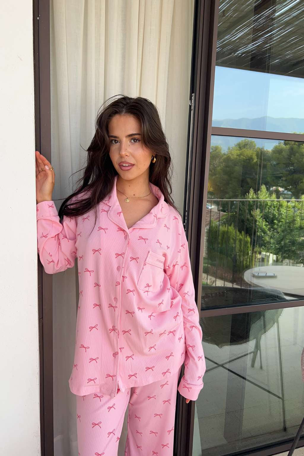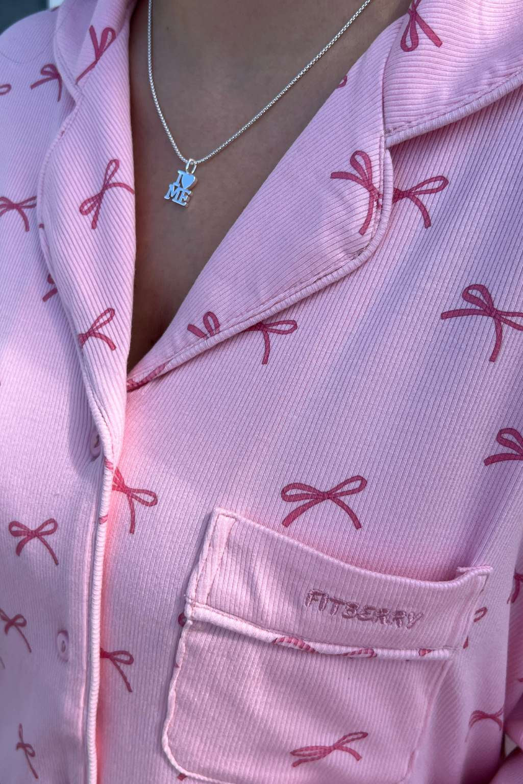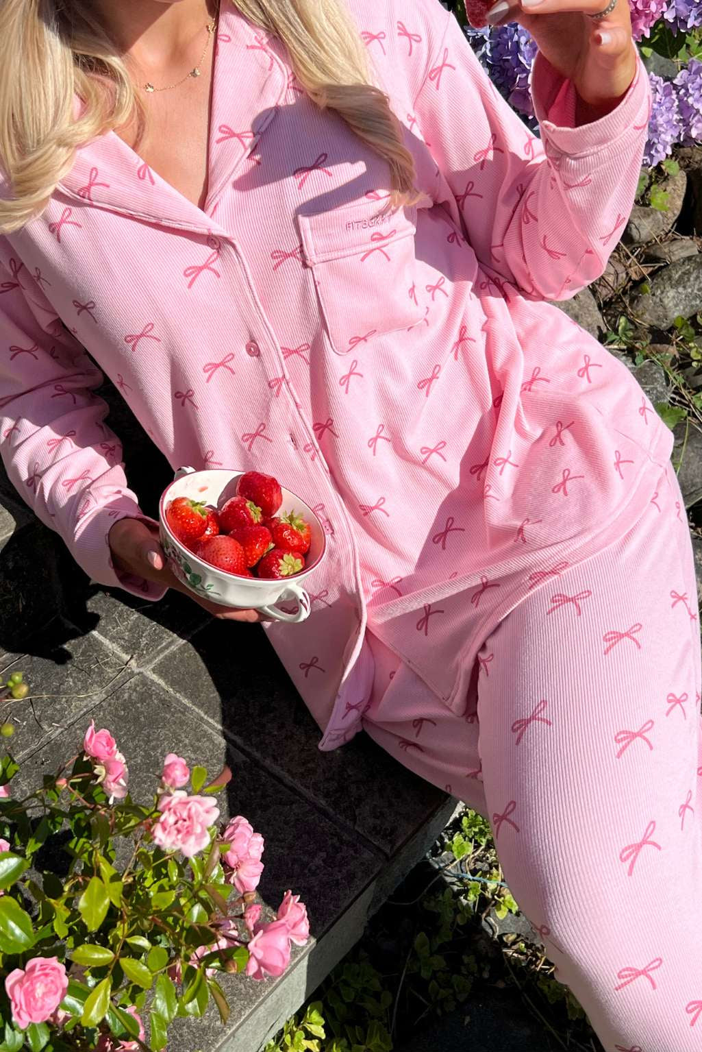 FITBERRY® RIBBON BLISS PYJAMAS SHIRT. The softest pyjamas shirt featuring ribbon print, dropped shoulders, buttoned front, long sleeves, loose fit and fitberry embroidered logo to chest. Crafted from a ultra soft and stretchy modal rib fabric.
