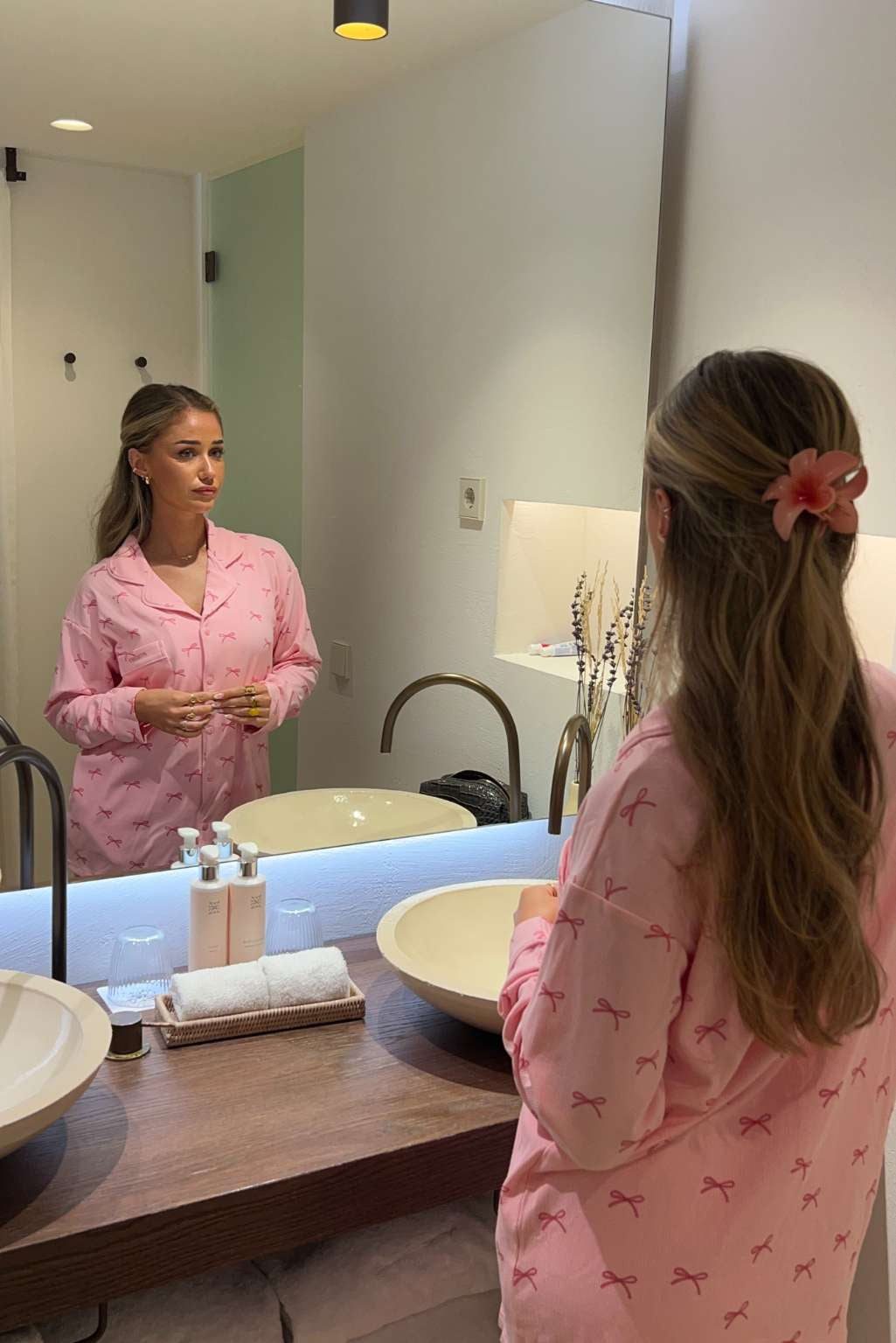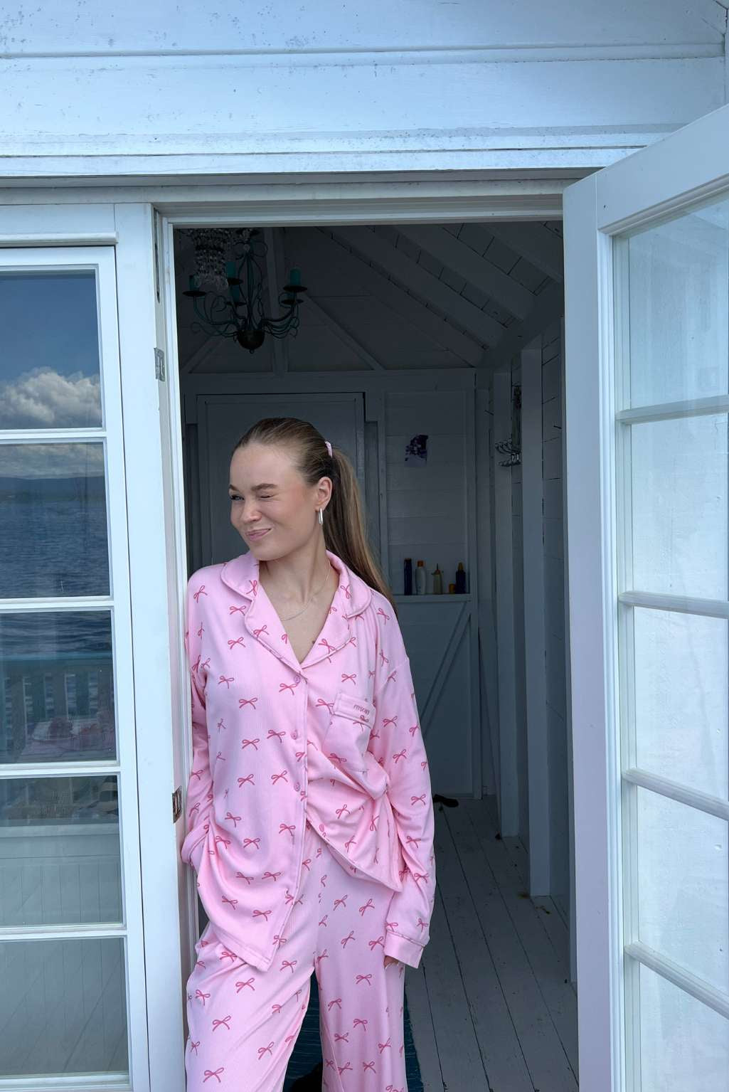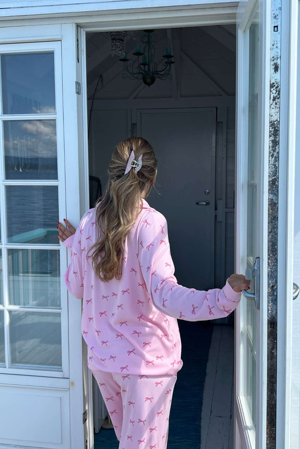 FITBERRY® RIBBON BLISS PYJAMAS SHIRT. The softest pyjamas shirt featuring ribbon print, dropped shoulders, buttoned front, long sleeves, loose fit and fitberry embroidered logo to chest. Crafted from a ultra soft and stretchy modal rib fabric.