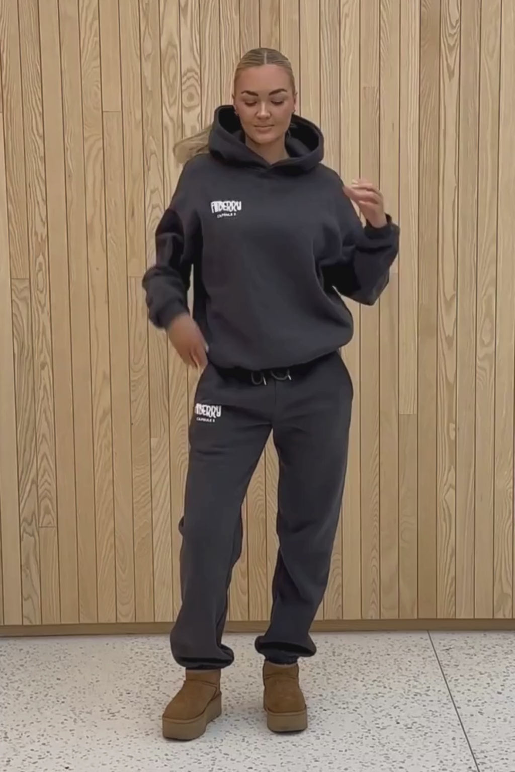 FITBERRY® SPORTS CLUB OVERSIZED HOODIE. An oversized hoodie crafted from a premium high-quality cotton fabric. The hoodie has a soft fleece interior, dropped shoulders, a cozy hood and ribbed details on the sleeves and waist. Featuring our signature Fitberry Sports Club Capsule 3 logo to front and back.