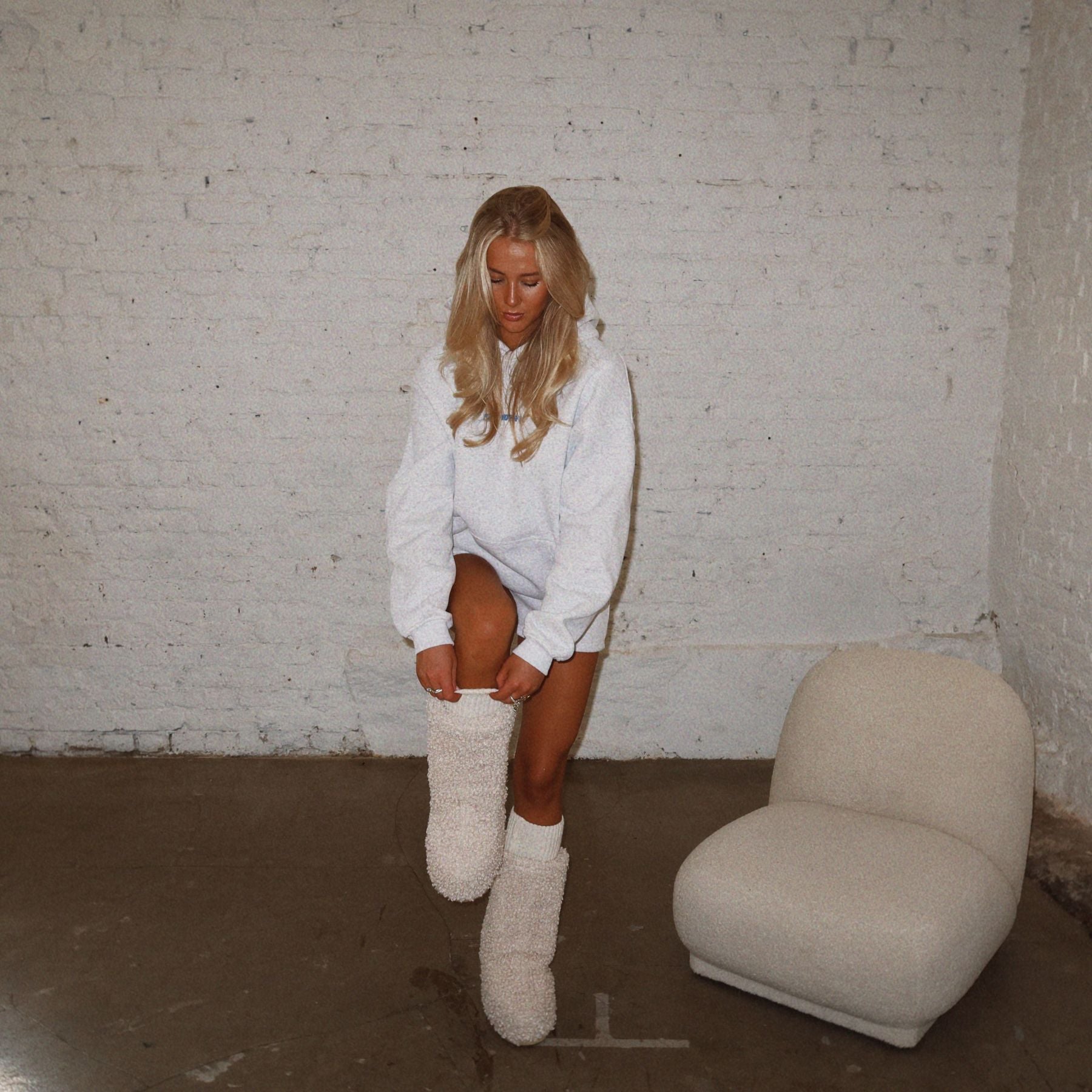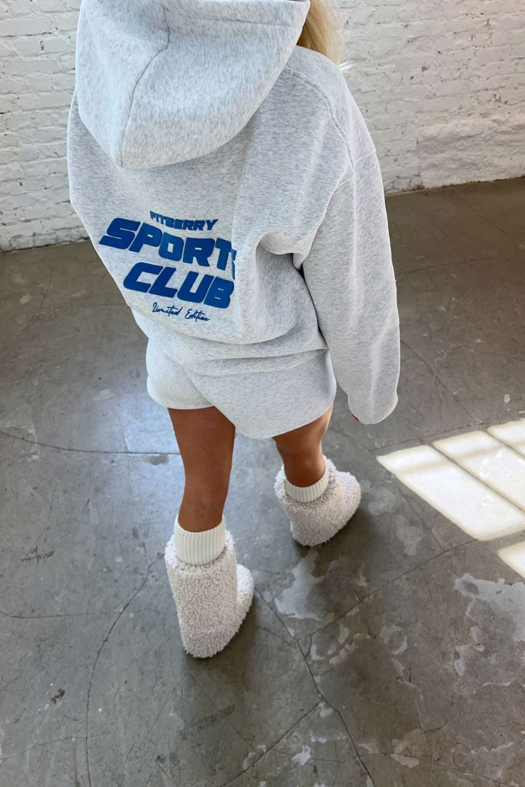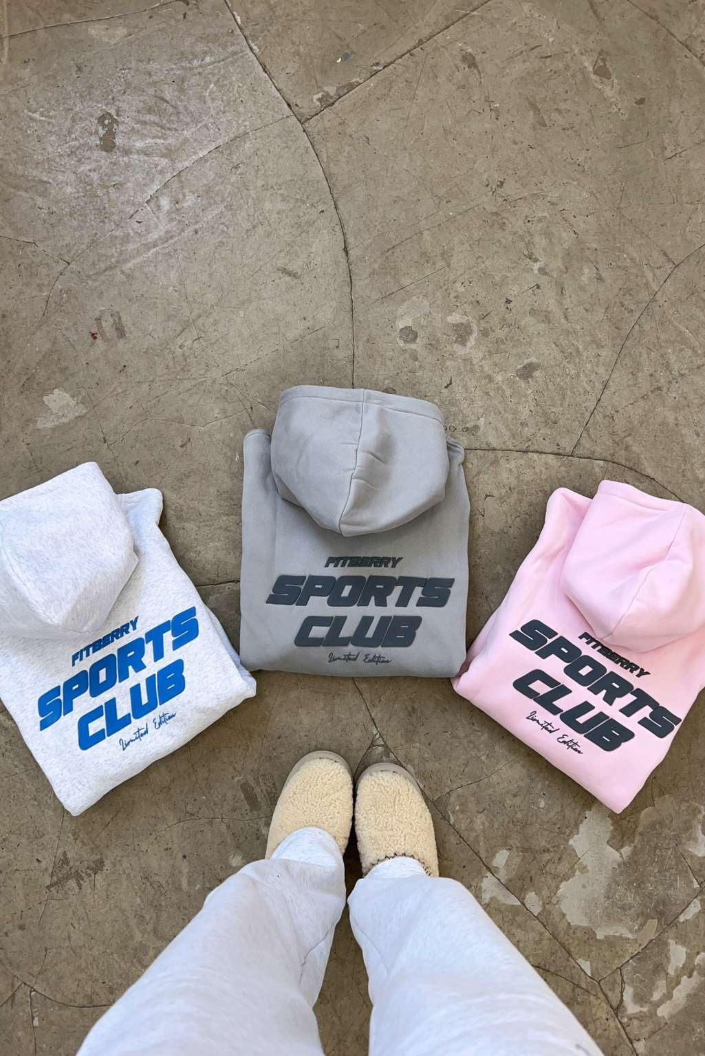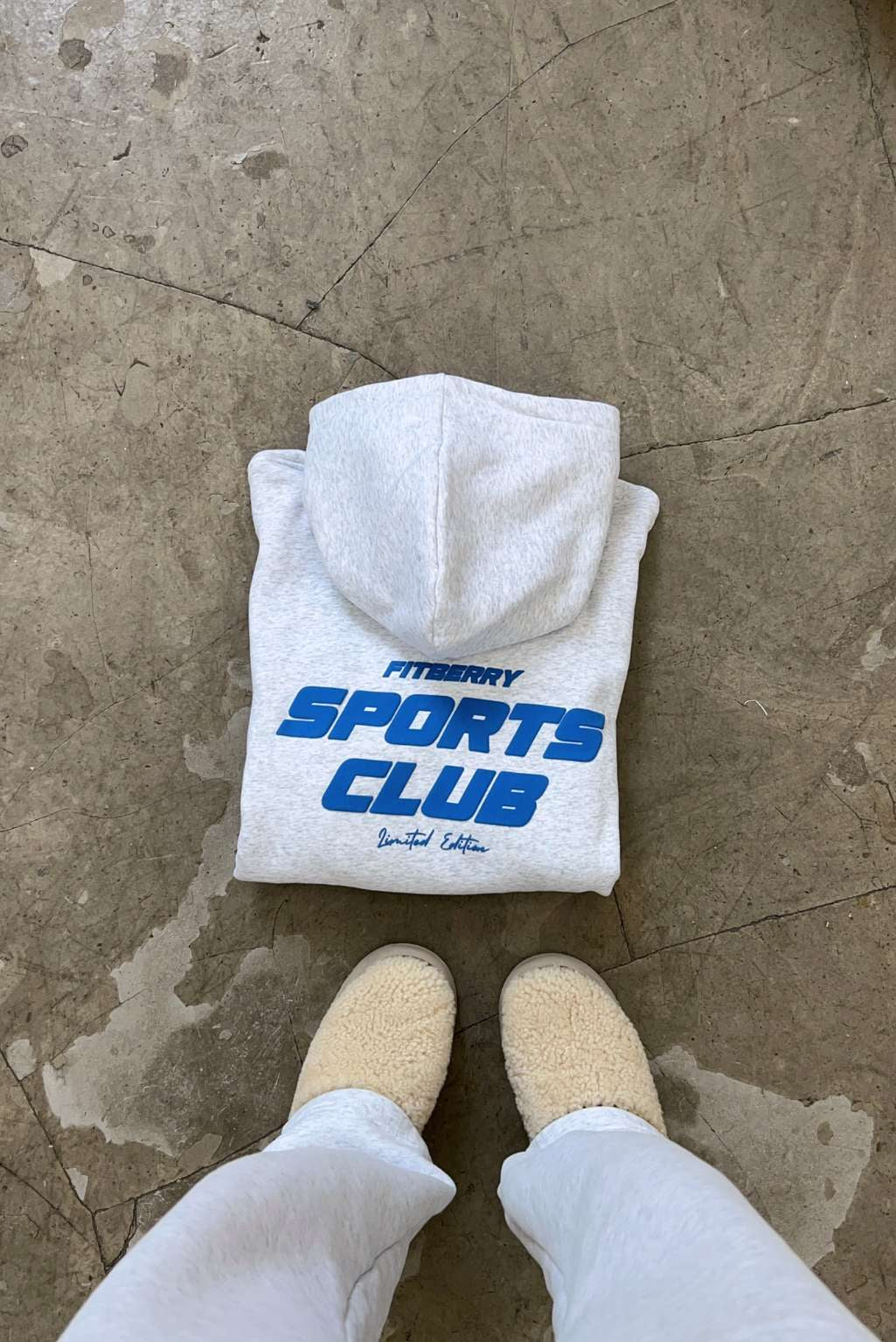 FITBERRY® SPORTS CLUB OVERSIZED HOODIE. An oversized hoodie crafted from premium high-quality cotton fabric. The hoodie has a soft fleece interior, dropped shoulders, a cozy hood, front pocket and ribbed details on the sleeves and waist. Featuring Fitberry Sports Club print to front and back.