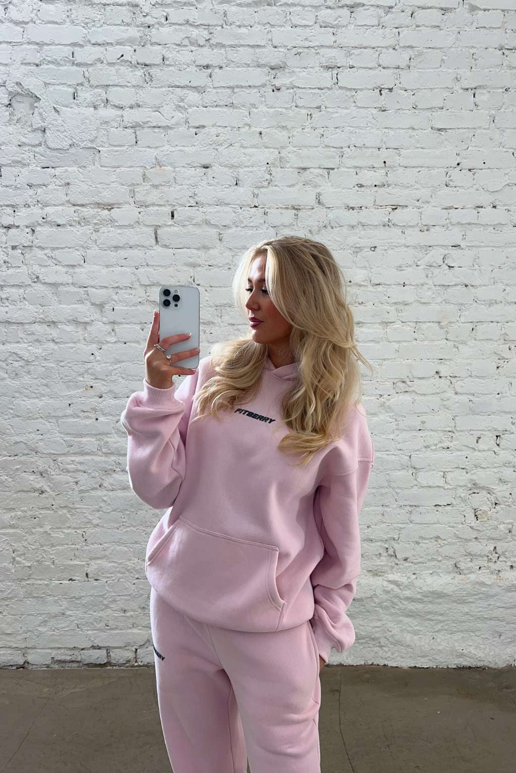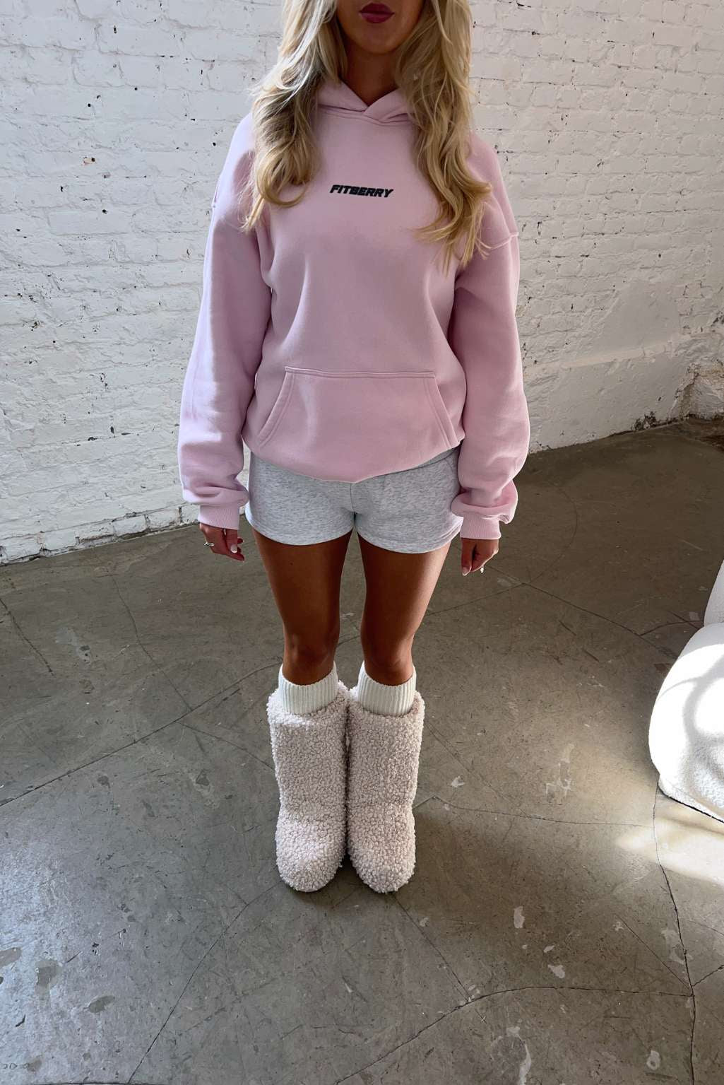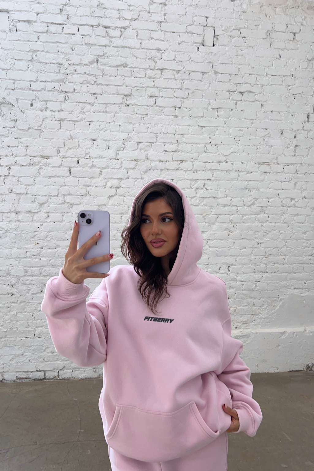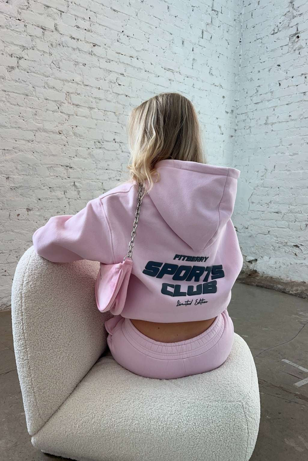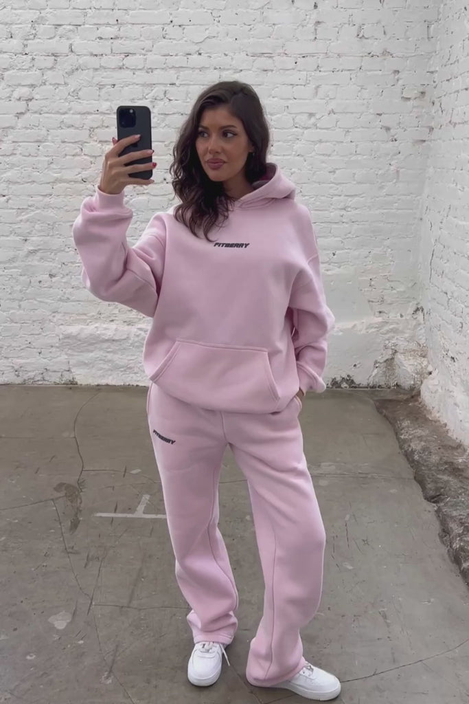 FITBERRY® SPORTS CLUB OVERSIZED HOODIE. An oversized hoodie crafted from premium high-quality cotton fabric. The hoodie has a soft fleece interior, dropped shoulders, a cozy hood, front pocket and ribbed details on the sleeves and waist. Featuring Fitberry Sports Club print to front and back.