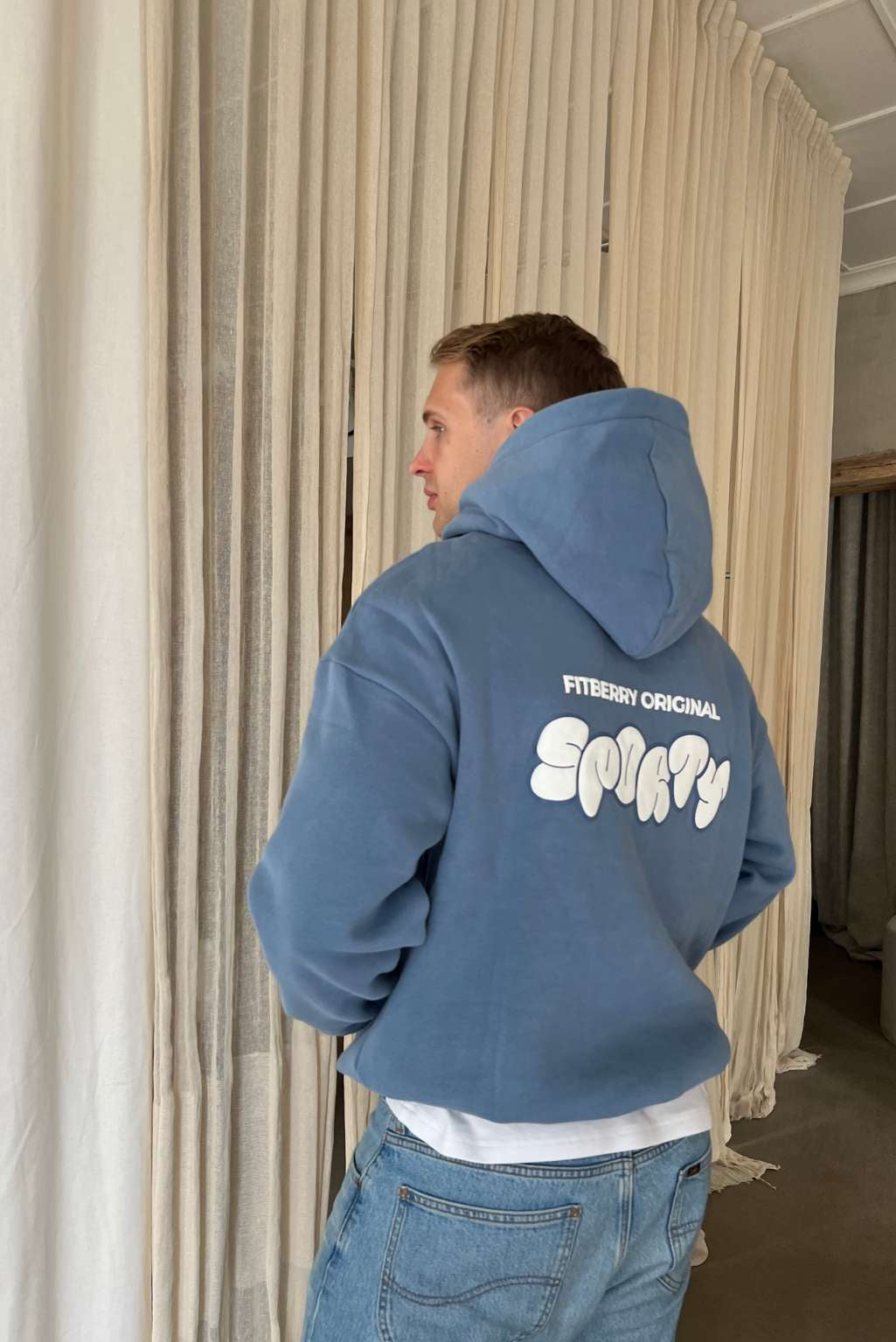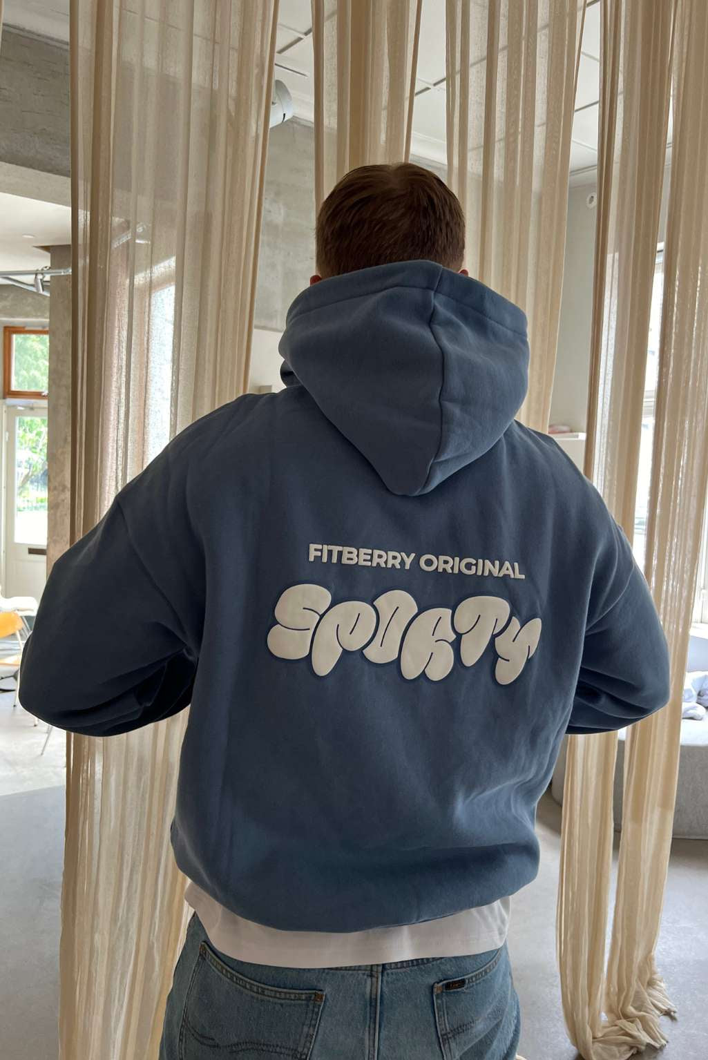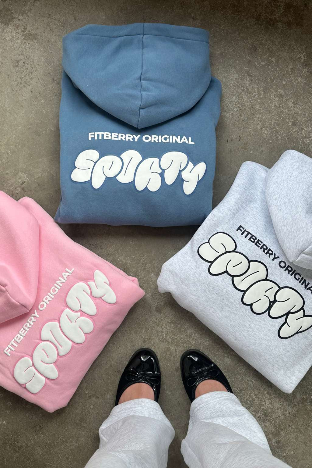 FITBERRY® SPORTY OVERSIZED HOODIE. An oversized hoodie crafted from premium high-quality cotton fabric. The hoodie has a soft fleece interior, dropped shoulders, a cozy hood, front pocket and ribbed details on the sleeves and waist. Featuring Fitberry Sporty print to front and back.