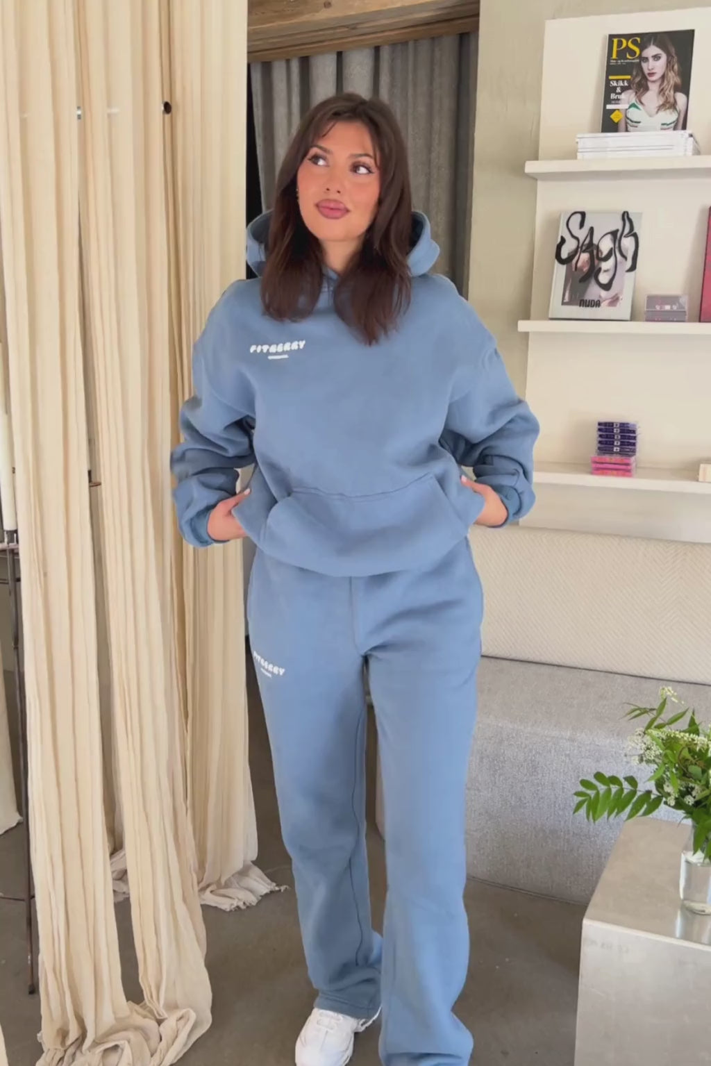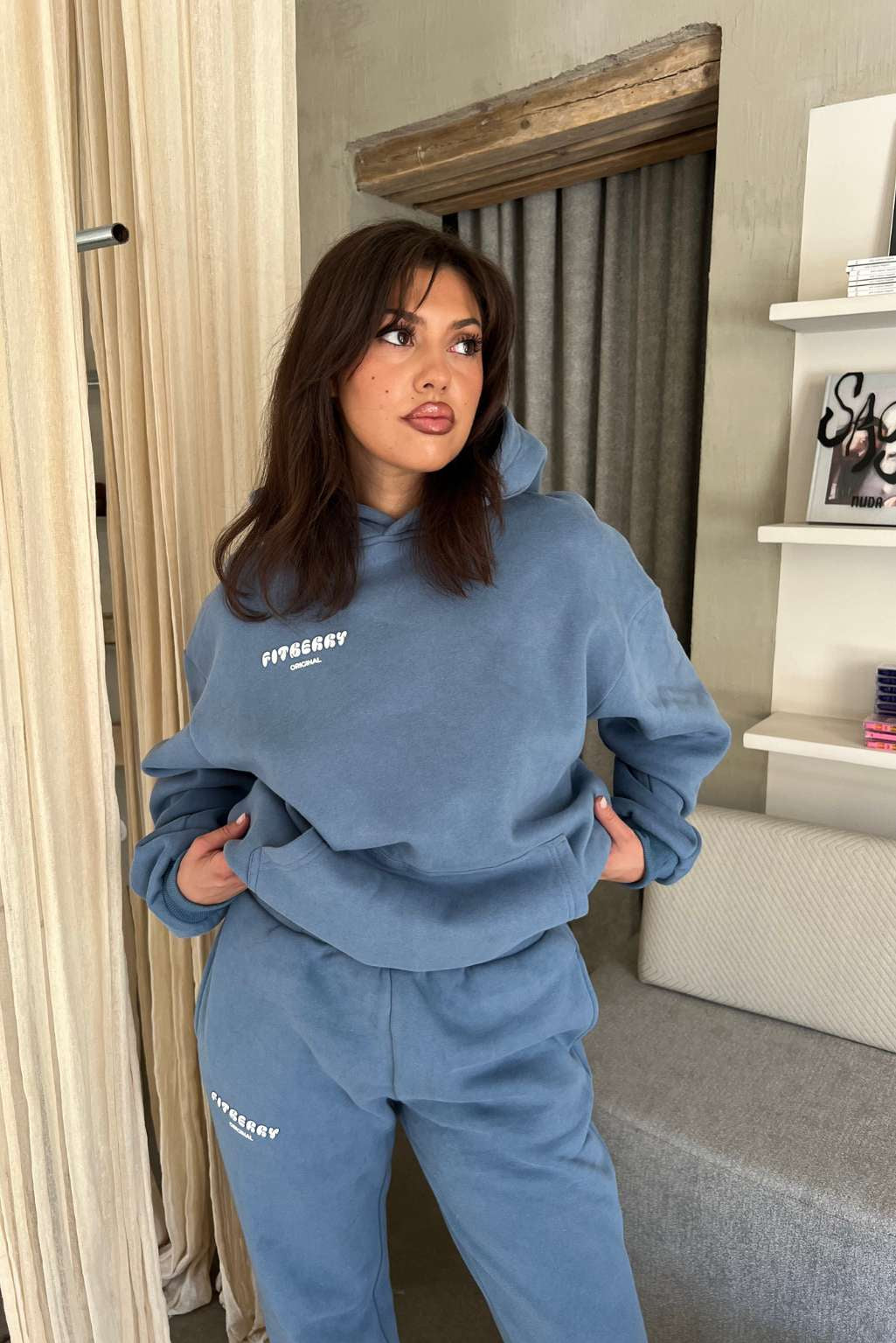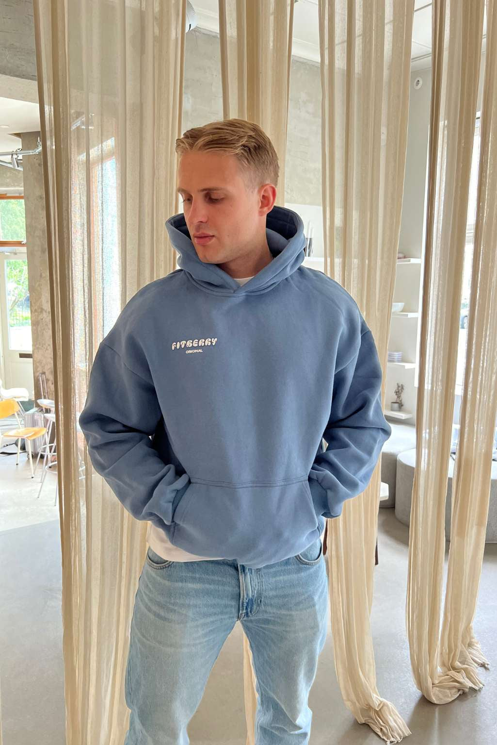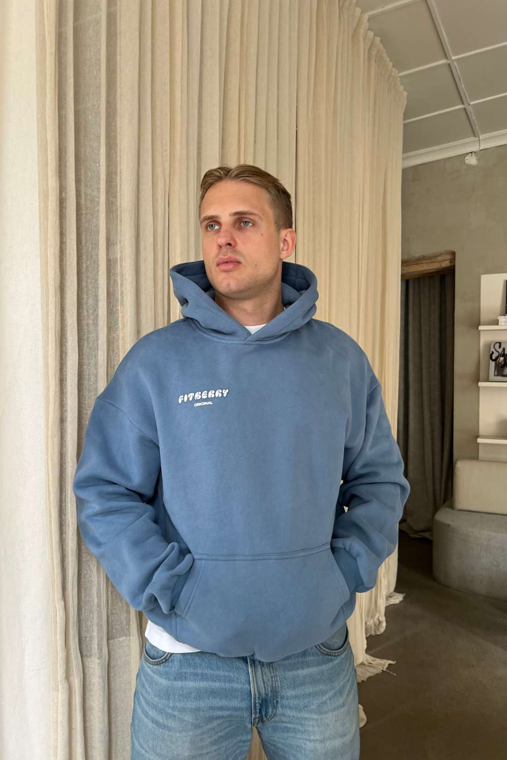FITBERRY® SPORTY OVERSIZED HOODIE. An oversized hoodie crafted from premium high-quality cotton fabric. The hoodie has a soft fleece interior, dropped shoulders, a cozy hood, front pocket and ribbed details on the sleeves and waist. Featuring Fitberry Sporty print to front and back.