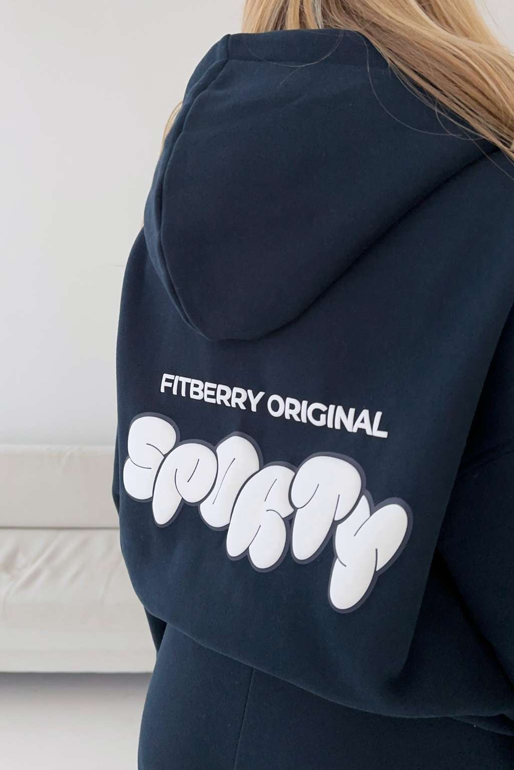 FITBERRY® SPORTY OVERSIZED HOODIE. An oversized hoodie crafted from premium high-quality cotton fabric. The hoodie has a soft fleece interior, dropped shoulders, a cozy hood, front pocket and ribbed details on the sleeves and waist. Featuring Fitberry Sporty print to front and back.