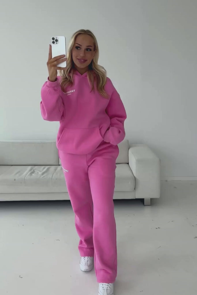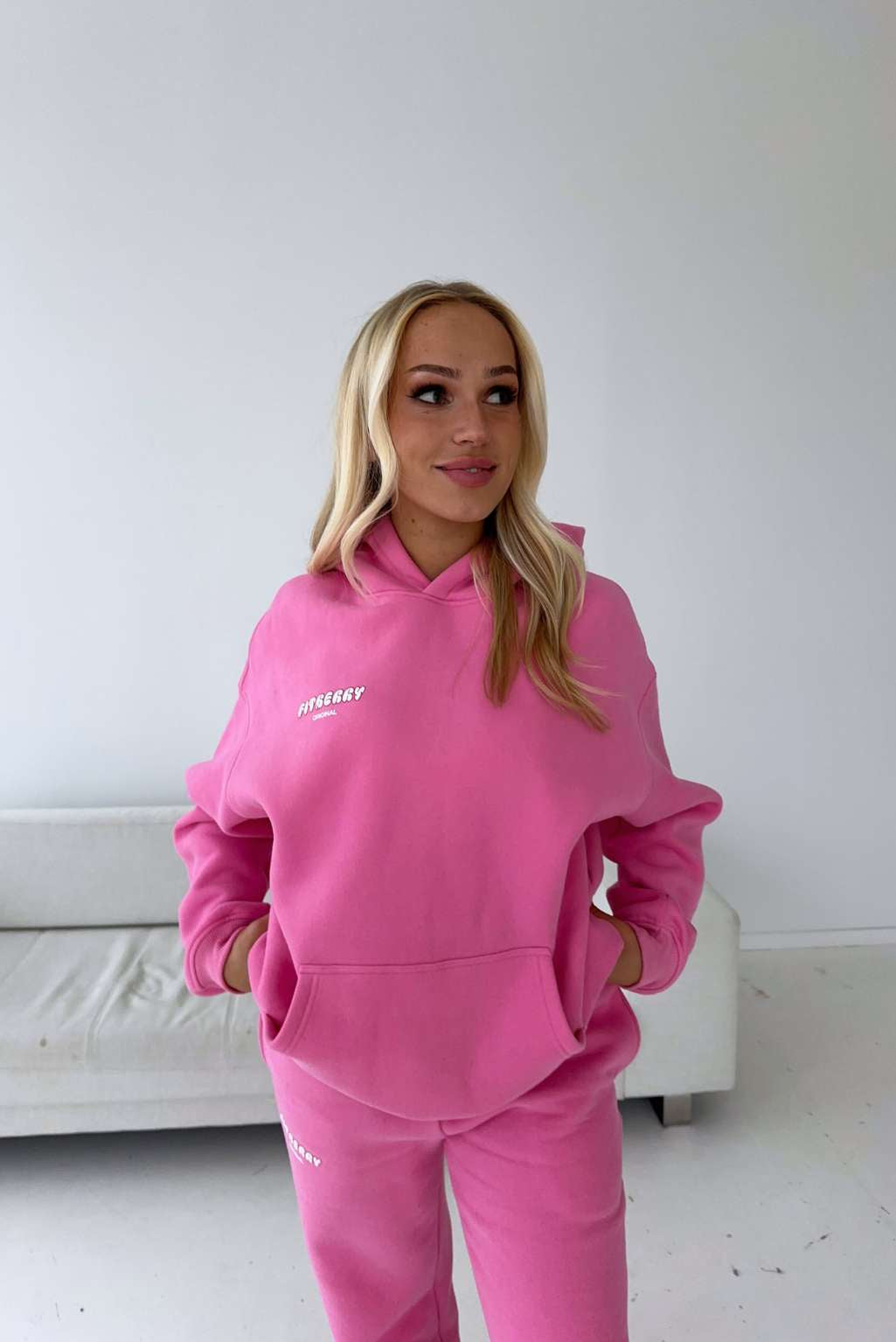 FITBERRY® SPORTY OVERSIZED HOODIE. An oversized hoodie crafted from premium high-quality cotton fabric. The hoodie has a soft fleece interior, dropped shoulders, a cozy hood, front pocket and ribbed details on the sleeves and waist. Featuring Fitberry Sporty print to front and back.