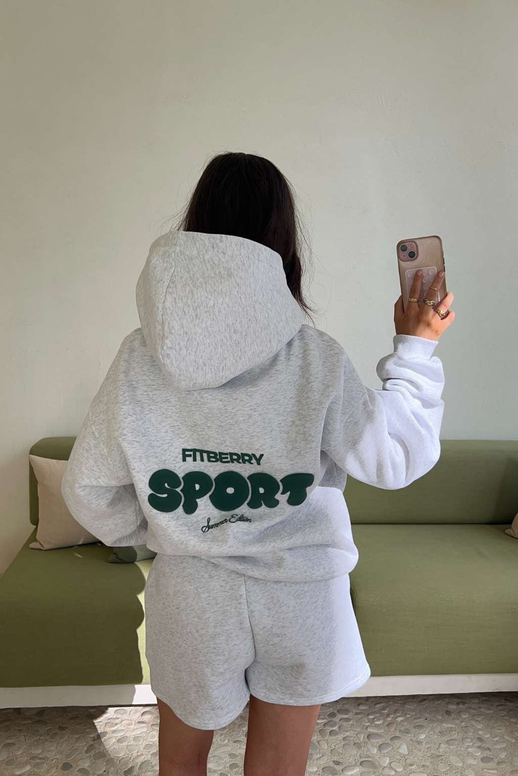 FITBERRY® SUMMER EDITION OVERSIZED HOODIE. An oversized hoodie crafted from premium high-quality cotton fabric. The hoodie has a soft fleece interior, dropped shoulders, a cozy hood, front pocket and ribbed details on the sleeves and waist. Featuring Fitberry Summer Edition print to front and back.