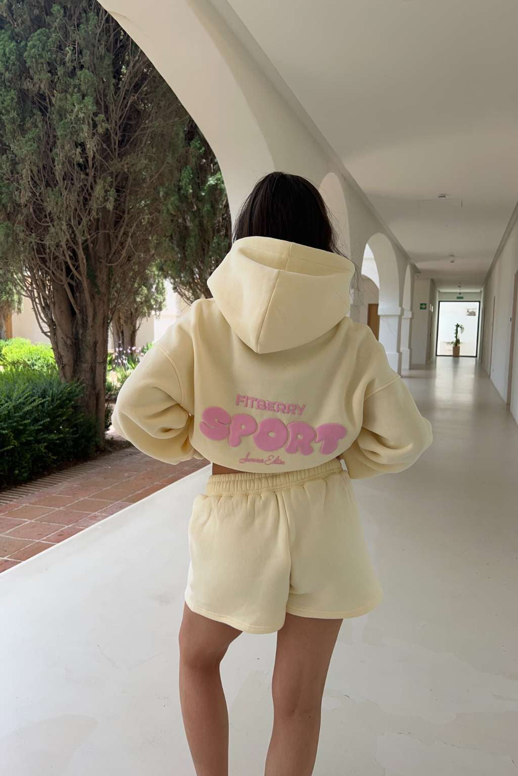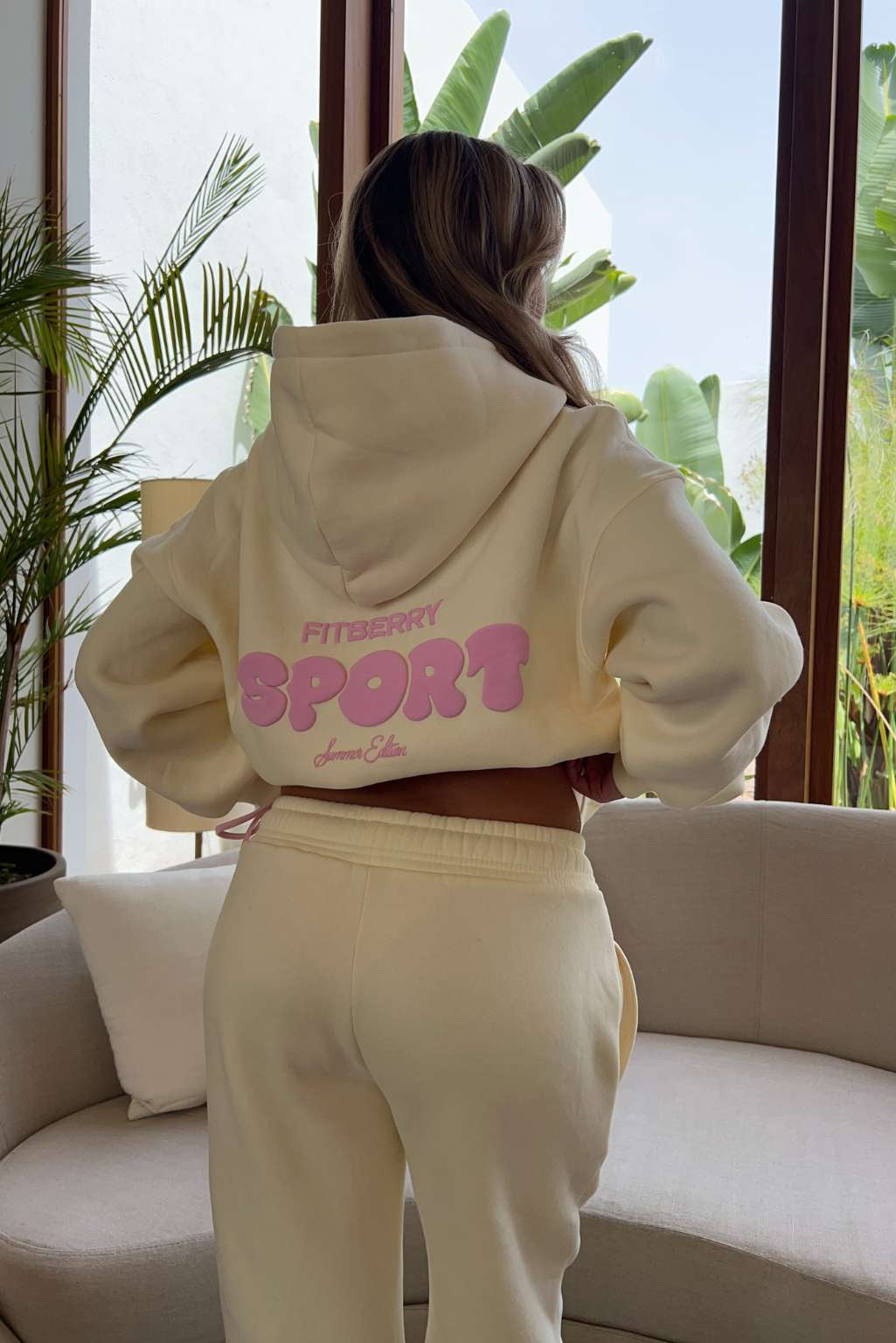 FITBERRY® SUMMER EDITION OVERSIZED HOODIE. An oversized hoodie crafted from premium high-quality cotton fabric. The hoodie has a soft fleece interior, dropped shoulders, a cozy hood, front pocket and ribbed details on the sleeves and waist. Featuring Fitberry Summer Edition print to front and back.