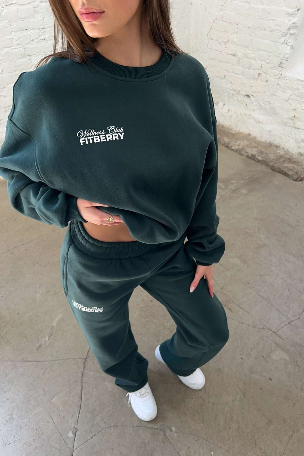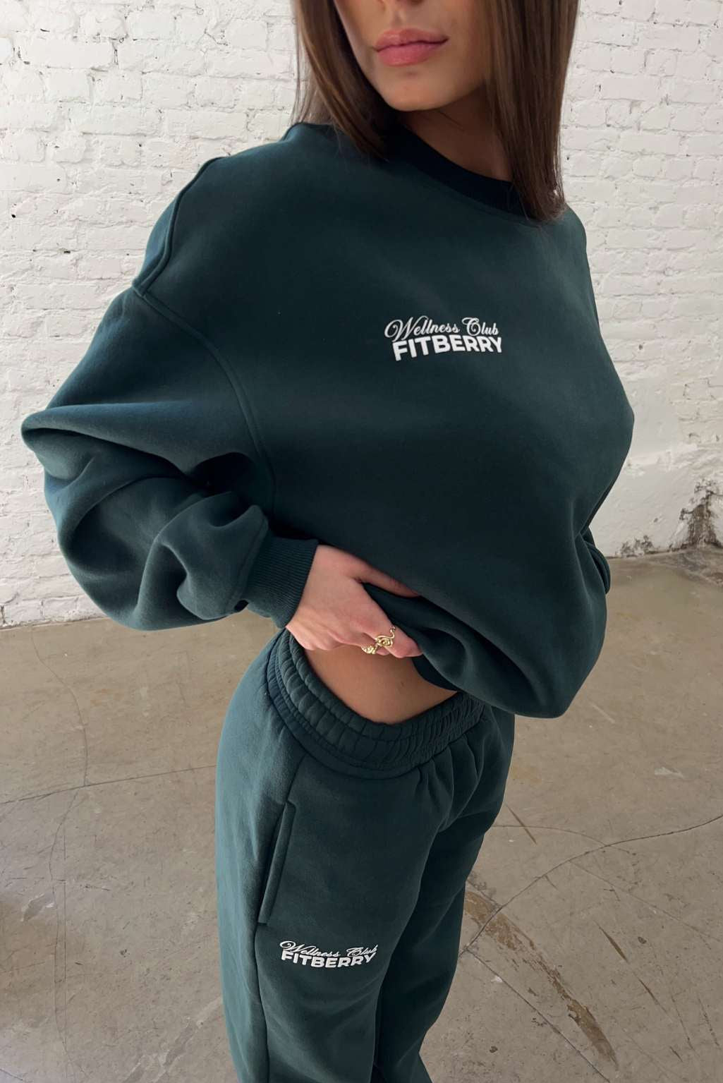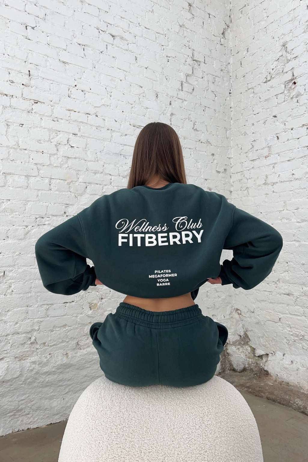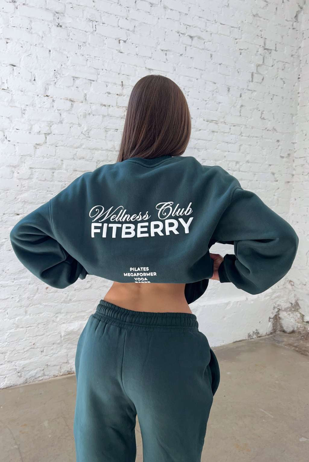 FITBERRY® WELLNESS CLUB OVERSIZED CREWNECK. An oversized crewneck crafted from premium high-quality cotton fabric. The crewneck has a soft fleece interior, round neck, dropped shoulders and ribbed details at the neck, cuffs and waist. Featuring FITBERRY® WELLNESS CLUB print to front and back.