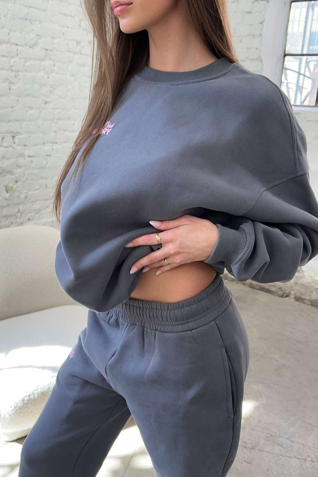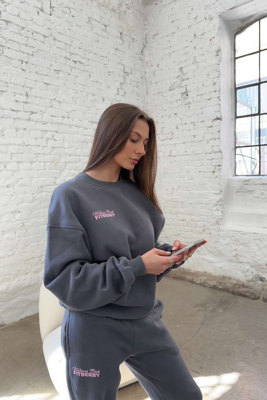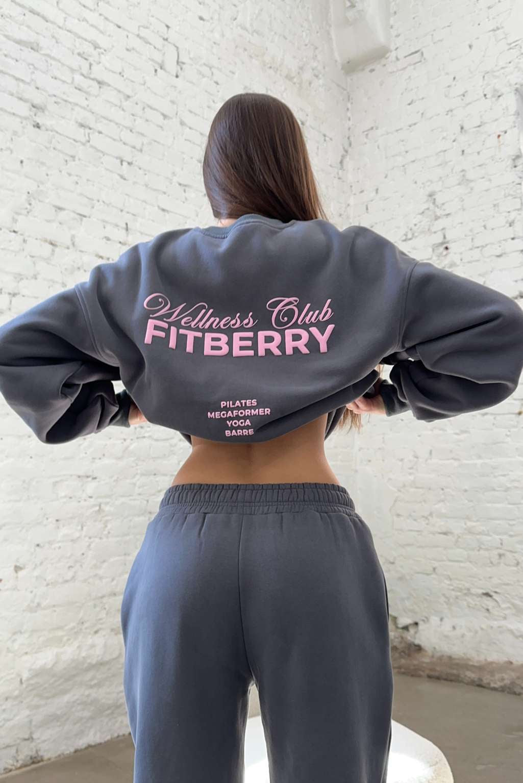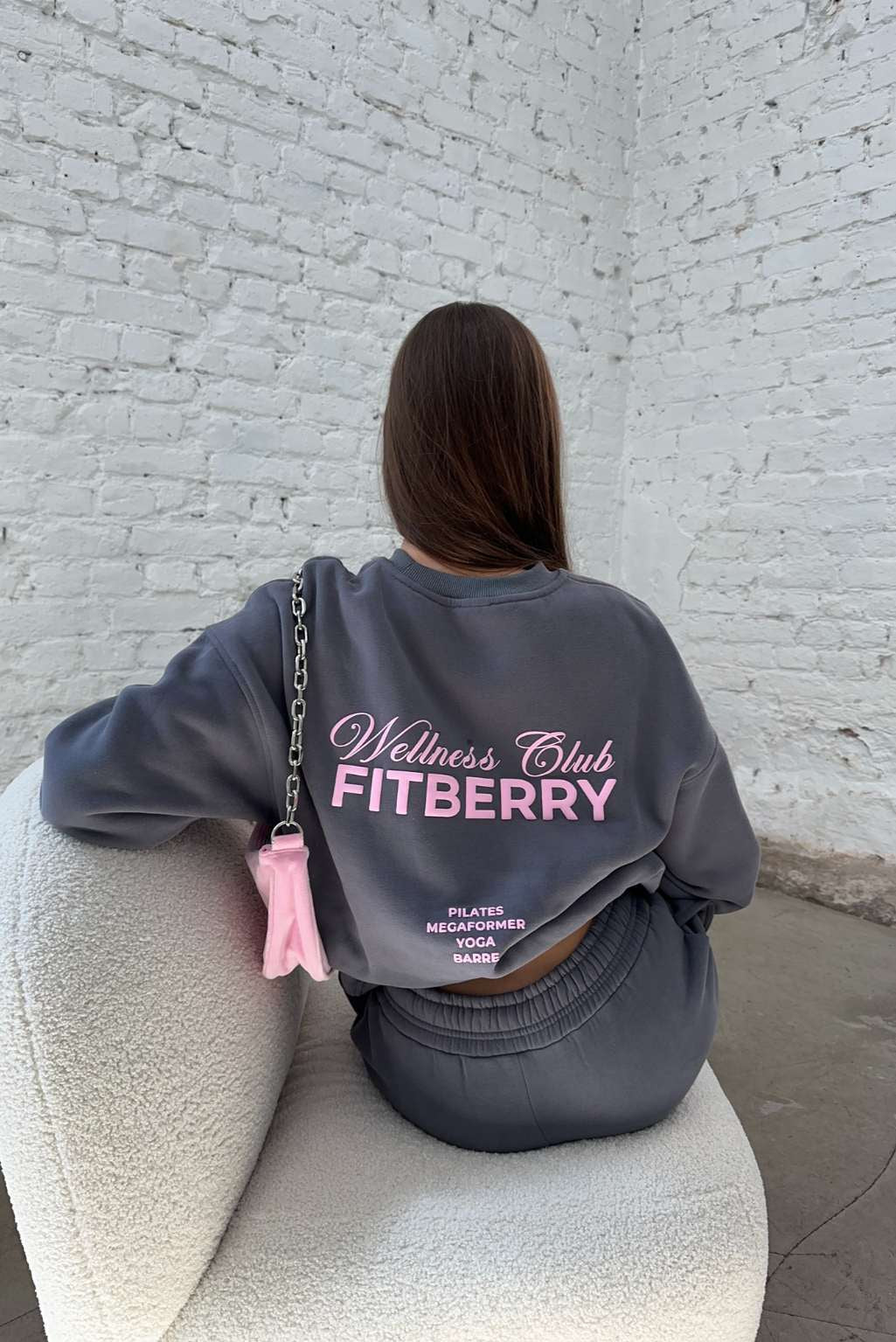 FITBERRY® WELLNESS CLUB OVERSIZED CREWNECK. An oversized crewneck crafted from premium high-quality cotton fabric. The crewneck has a soft fleece interior, round neck, dropped shoulders and ribbed details at the neck, cuffs and waist. Featuring FITBERRY® WELLNESS CLUB print to front and back.