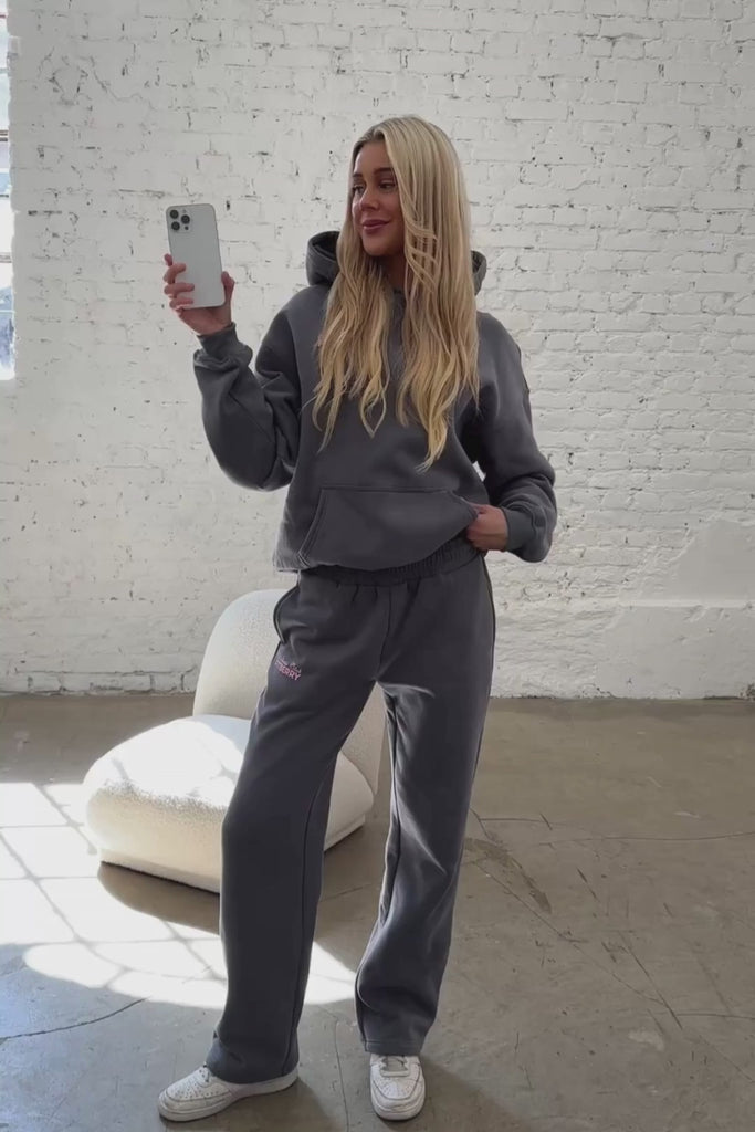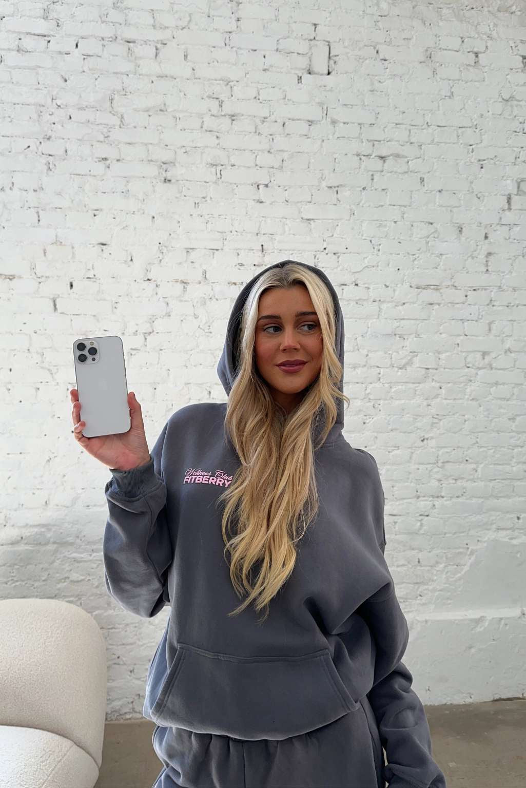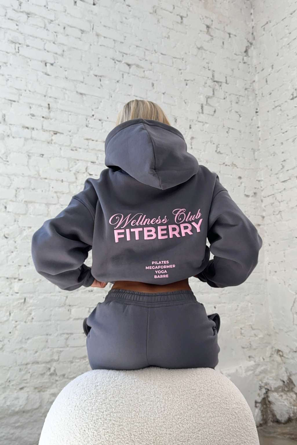 FITBERRY® WELLNESS CLUB OVERSIZED HOODIE. An oversized hoodie crafted from premium high-quality cotton fabric. The hoodie has a soft fleece interior, dropped shoulders, a cozy hood and ribbed details on the sleeves and waist. Featuring FITBERRY® WELLNESS CLUB print to front and back.